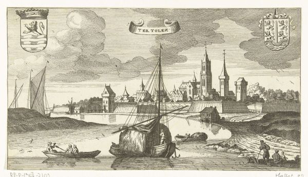 Curator: Welcome! We are standing before "Gezicht op Rhenen," an engraving from sometime between 1692 and 1714, currently held at the Rijksmuseum. The work is attributed to Thomas Doesburgh. Editor: It’s incredible the amount of detail rendered in what looks like an almost clinically precise, light-drenched scene. The composition feels balanced but static, like a stage set. Curator: It’s interesting that you note that, as I think understanding the labor and tools is important here. As a print, it's likely meant for widespread consumption. Doesburgh had to meticulously create a plate for printing, indicating a specialized, artisanal skill serving early Dutch capitalism by rendering cities desirable and thus economically viable. Editor: Absolutely. The composition, organized with such clarity and geometric precision, reflects more than simple commerce; note how he renders each structural component! The windmills, the church tower, the boats on the river—each object has its own discrete integrity. How Doesburgh achieves this with such subtle gradations of line weight is fascinating. Curator: Right, consider also that paper, ink, and the printing press all are elements in its production and dissemination. The affordability of prints compared to paintings enabled a broader audience to engage with art, challenging the elite art patronage system. Editor: I appreciate the formal tension between the calm skyline of Rhenen and the dynamic details of daily life, which offers this very satisfying sense of spatial organization, you know, this beautiful tension between foreground and background. Curator: It's compelling to consider how prints like these also acted as records of specific urban identities. The emphasis is not just aesthetic; it demonstrates Rhenen’s social structure and the lives of its residents, rendered within the frame of burgeoning economic activities. Editor: Well, considering our discussion, I have renewed interest in revisiting the way it so brilliantly portrays this cultural ethos by aesthetic form, almost as though form and purpose, art and commerce, find true confluence in this print. Curator: Indeed, thinking about the work in terms of its function as visual document is compelling as well, as the social meaning imbued through it provides much food for thought.