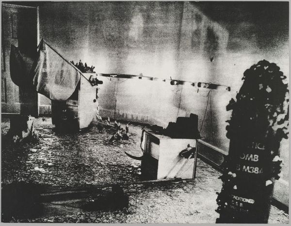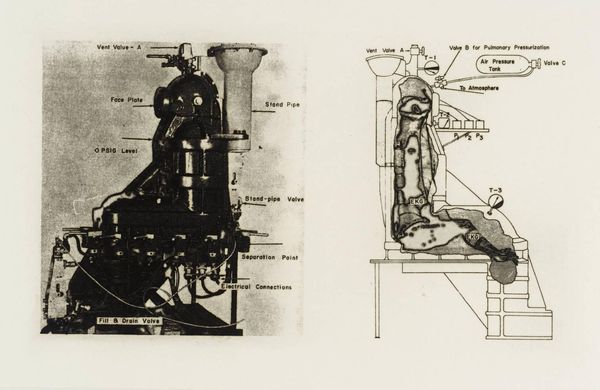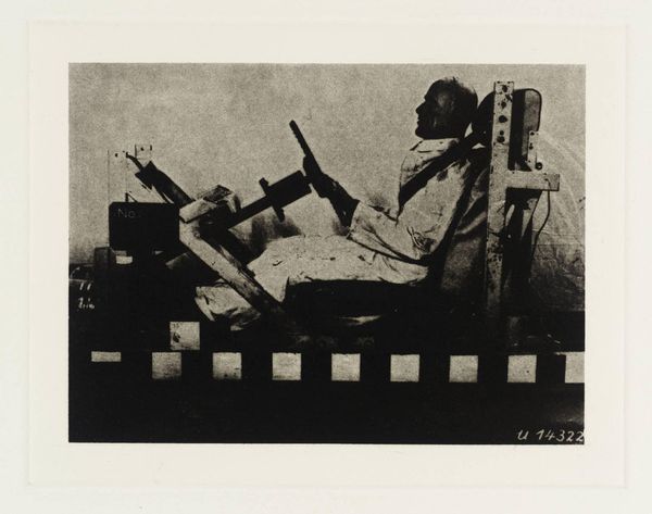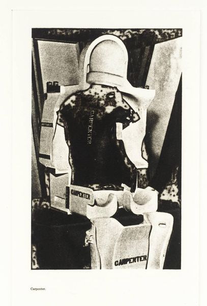 Editor: Here we have Eduardo Paolozzi's "Manikins for Destruction: Untitled (Broken Open Dummy Skeleton)." It’s a black and white image, quite small, depicting what looks like a broken mannequin. What draws your eye when you look at this work? Curator: The layering of materials and their apparent purpose is key. The dummy, the metal frame, all imply mass production and function. But broken, they speak to the fragility of these systems and the human cost embedded in their creation and potential destruction. Editor: So, you see the broken mannequin as a comment on the system of production itself? Curator: Precisely. Consider the labor involved in creating both the dummy and the apparatus. Paolozzi pushes us to question what these objects represent beyond their initial function. Editor: I see, the focus shifts from the object itself to the process of its creation and its role in a larger system. Curator: Exactly. Hopefully, listeners can explore that tension through Paolozzi’s work.