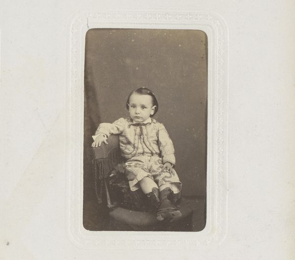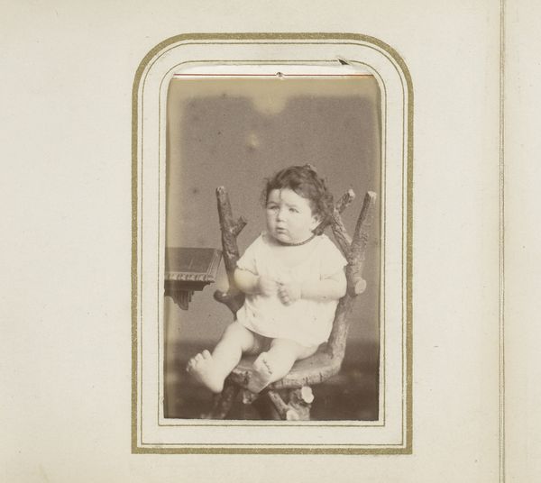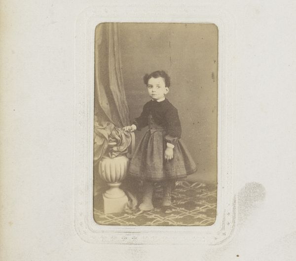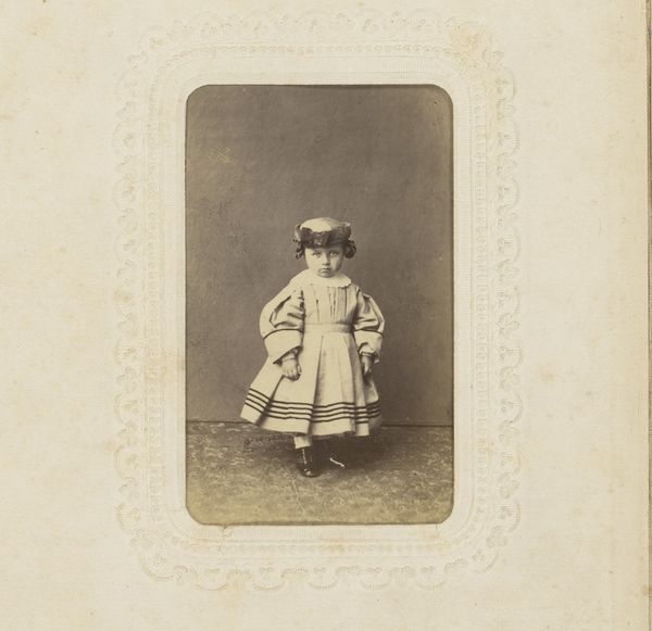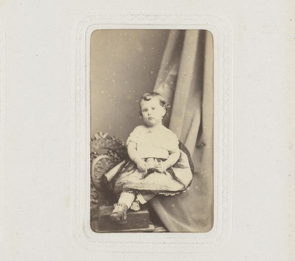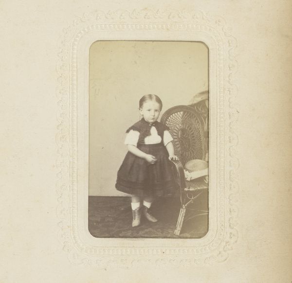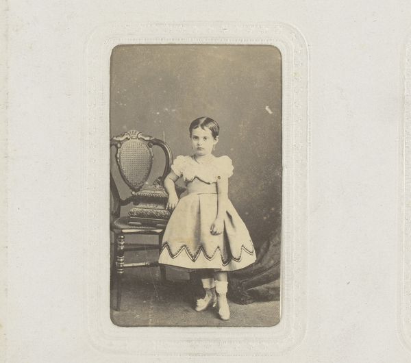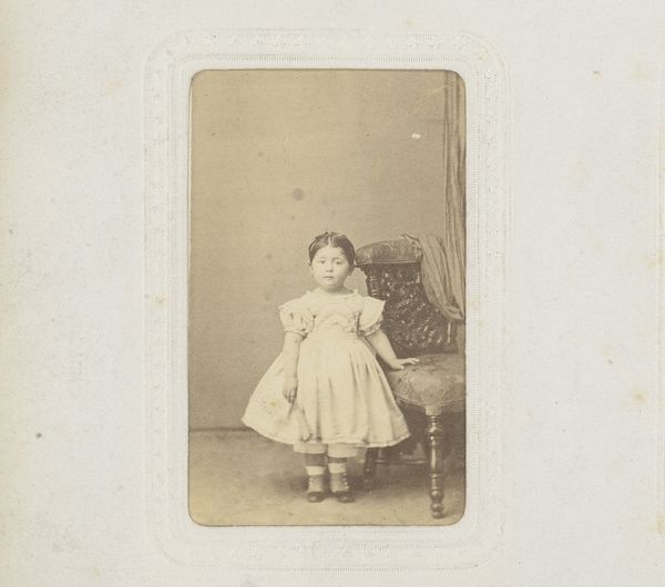Curator: What strikes me immediately is the solemnity in her gaze. Editor: Agreed. We're looking at "Portrait of a Girl, Standing on a Chair," a gelatin-silver print, placing it somewhere between 1860 and 1890. Genre-painting as captured through a photographic lens. It’s attributed to Samuel A. Cohner. Curator: There's something undeniably timeless in those studio portraits. The formal posture of the girl contrasted against the soft dress, it’s precious in a way. And that knowing look, far beyond her apparent years, perhaps she's sensing this momentous occasion? Editor: Children's portraits, especially in the 19th century, always carried a lot of cultural weight. They weren't just cute snapshots. The chair, the dress – these are all symbols. Reminders of childhood as this precious but fleeting time of innocence, the dress being white points out at that exact innocence. It carries with it notions of status and upbringing. Photography in its infancy aimed for painting likeness and narrative strength and so did portraits in its time. Curator: Exactly! The carefully arranged backdrop and ornate frame give it the air of a mini theatrical production. What's that expression they used to use? Carte de Visite, or visiting card! Editor: In an interesting perspective yes! The child and chair are stage props almost. But look closer! The small, delicate cross around her neck adds this further layer of the image. The subtle nod to faith, almost. The spiritual underpinning to how children are regarded. Also that dark stripe across the hem of the dress? Curator: Hmm, like she’s already straddling the adult world, her feet literally half way down? Like a threshold or crossroads, which makes the symbol more intriguing. You start to construct her history based on details left here, a world ready to bloom into new stages. A tiny bit melancholy too, to be honest. Editor: Maybe we project our adult perspectives too much, seeing these serious portraits as burdened. But yes. As Iconographer, you do make the artwork more poignant and real for all that lives between the knowns. Curator: Likewise to the insights of a trained expert like yourself.
