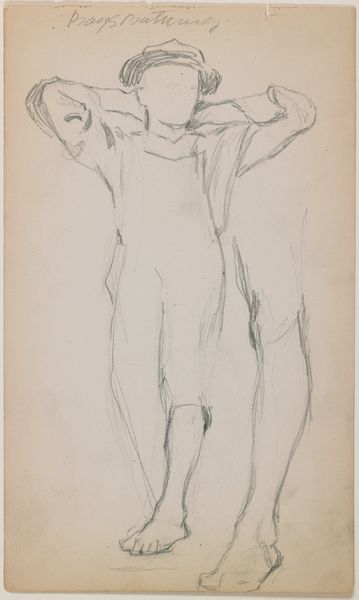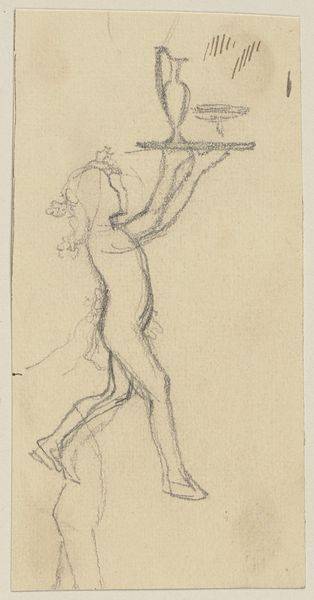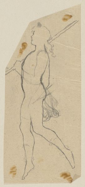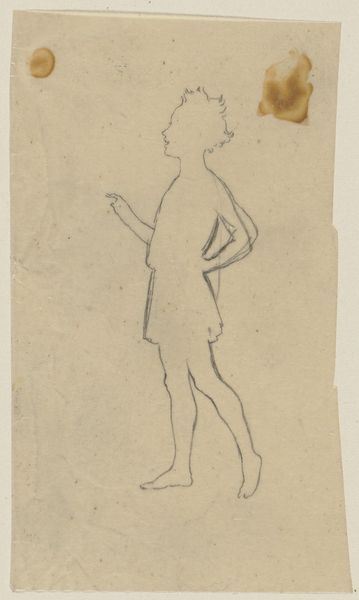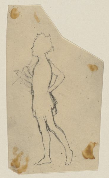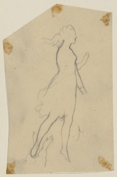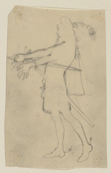 Editor: So, this drawing, "Francis Flute as Thisbe mit Schwert, stehend, nach links," circa 1867-1868, by Paul Konewka… It's pencil on paper and currently held at the Städel Museum. There’s a real lightness to it, almost ethereal. But I’m curious, what jumps out at you when you see it? Curator: Well, darling, isn’t it enchanting? The immediacy of the sketch, the wisp of a figure conjured from so few lines… it's almost as if we've caught a fleeting glimpse of Shakespeare’s world. See how Konewka captures not just the likeness, but the *performance*? Flute, a weaver, remember, awkwardly portraying Thisbe – tragedy undercut with comic reality. You almost feel sorry for the chap. Have you seen this character portrayed elsewhere? How does this pencil work hold up, would you say? Editor: That's interesting. I see the comedic potential now, the inherent awkwardness of the pose. In other works, say, Delacroix, theatrical figures always seem so assured. Here, it’s definitely more…vulnerable. Curator: Precisely! Konewka allows that vulnerability to breathe. His romanticism isn't grandiose, but deeply human. Look at the hesitant reach of the arm, the tentative placement of the feet! What does it remind *you* of? Do you see anything anachronistic? It feels utterly immediate, almost as if drawn from life. It reminds us that even high art draws from the messy stuff of living, the stumbling, imperfect efforts we all make to express something profound. And did you know Konewka started his artistic career creating silhouette portraits? Editor: Silhouette portraits? I didn't know that! I can definitely see how that might influence the linework here. I really thought this would be a straightforward drawing, but I like how much it plays with the contrast between comedy and tragedy. Thanks for your insight. Curator: My pleasure. It’s those unexpected juxtapositions that keep art eternally fascinating, wouldn't you say? It always leaves one changed.