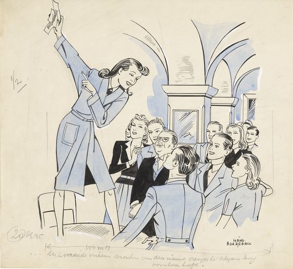 Hans Borrebach made this drawing of a patron addressing a waiter with ink on paper, at some point in his life. The bold strokes of ink, especially in the waiter’s uniform, give the piece a graphic, almost poster-like quality. It’s immediate, confident, but also leaves room for our imagination to fill in the details. I'm drawn to the way Borrebach uses these darks and lights to suggest form and depth. It's like he’s saying, “Here’s the basic structure, now you do some of the work too." The stack of plates the waiter is holding is rendered so simply, almost abstractly, just a series of lines and curves. Yet, it totally reads as a precarious tower of crockery, doesn't it? It reminds me of some of Philip Guston's later, more cartoonish paintings, where he used a similar shorthand to depict everyday objects. It feels like Borrebach is winking at us, inviting us to play along, to see the world with a bit of humor and lightness. Ultimately, art is about an exchange of ideas and perspectives, a conversation that continues across generations.