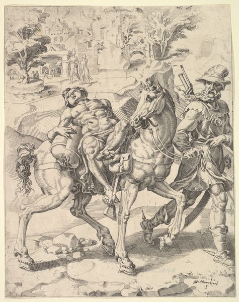 This print, "Het grote paard," was created around 1564 by Wierix and is currently held at the Rijksmuseum. Note the striking contrast between the massive, almost bulbous rear of the horse and its more delicately rendered head and forelegs. Wierix’s use of engraving allows for intricate detail, particularly in the textures of the horse's coat and the rider's armor. The composition is structured by a strong vertical axis, anchored by the classical column to the right, which opposes the natural, almost wild rendering of the horse and foliage. This juxtaposition creates a tension between classical order and natural vitality, perhaps reflecting the Renaissance interest in harmonizing humanistic ideals with the natural world. The semiotic weight of the horse is significant; it's a symbol of power and status, yet its exaggerated form challenges conventional representations of equestrian nobility. Is Wierix commenting on the burdens of power, or perhaps subverting the ideals of classical beauty? Such questions remain open, inviting us to continually re-evaluate the artwork's complex layers of meaning.