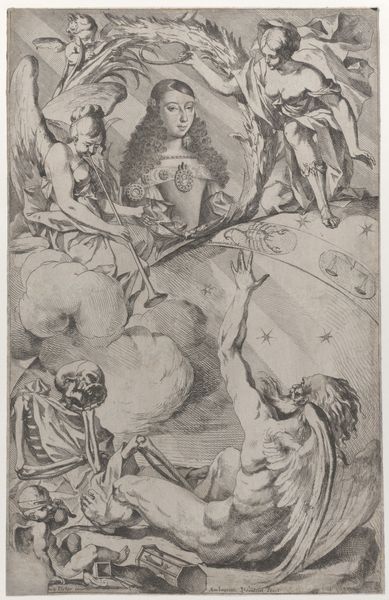 This is an anonymous design for a title page, rendered in pen and brown ink with gray wash. In it we see a confluence of mythical, gendered, and racialized figures. A regal woman sits enthroned, draped in classical robes, while a horned satyr leans familiarly over her shoulder, his gaze directed to the viewer. At her feet, putti play, seemingly oblivious to the scene unfolding behind them. In the shadows, a figure raises a club, a subtle reminder of the violence underpinning even pastoral scenes. The juxtaposition of the refined, idealized woman with the bestial satyr speaks to enduring cultural anxieties about female virtue and male desire. The use of putti, often associated with innocence and purity, further complicates the narrative. What unspoken stories do you imagine these figures hold? Consider the power dynamics at play, and how these classical motifs reflect the social and moral codes of their time.