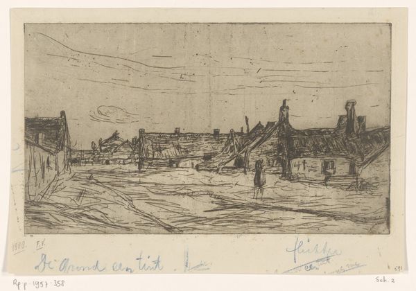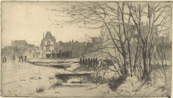 Curator: Looking at Willem Adrianus Grondhout’s “Landschap met molen in de Binckhorst in Den Haag,” created in 1916 using etching, I'm struck by the way the artist chose this particular printmaking process. Editor: Yes, the landscape comes across beautifully, with this delicate rendering of a windmill in its setting. What's your reading of the materiality here? Curator: Well, consider etching's reliance on acid and metal. It's a process born from industrial practices. By choosing this medium to depict a landscape with a windmill, traditionally a symbol of pre-industrial labor, Grondhout creates a fascinating dialogue. He uses a technique rooted in mass production to capture a scene that’s rapidly disappearing because of it. What do you make of that tension? Editor: That’s very insightful. I hadn’t thought of the industrial process behind the etching itself. So you are suggesting that the material connects to the means of production of the time, a commentary about landscape change? Curator: Precisely. And the fact that it's a print, designed for multiple impressions, speaks to consumption and distribution – turning a unique view into something reproducible and accessible. Look closely at the layering of lines, the labor evident in the creation of the plate... all of this brings materiality into focus. Editor: It's fascinating to consider how the choice of etching underscores these broader societal shifts through its own process and possibilities. It really highlights the means of production, as you put it, not just the pastoral subject. Thanks for pointing that out! Curator: Absolutely. Thinking about art through the lens of material and production opens up so many avenues for interpretation. It's not just about what's depicted, but how it was made, by whom, and for what purpose.