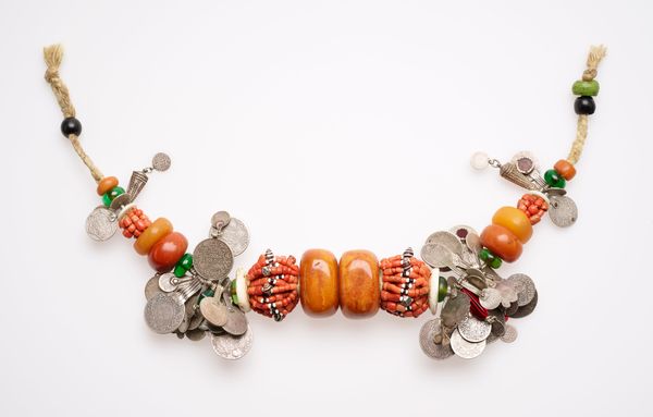 These ear pendants were made by Ait Jerrar Amazigh, and it's amazing how different materials come together to form these intricate designs. There's something so appealing about how these pieces were assembled, the mix of coral, silver, and glass beads creating a visual dance. What strikes me is the texture and the slight imperfections, like the rough edges of the silver, or the small scratches on the glass. It's almost as if the artist is saying, ‘Here it is, in all its imperfect glory.’ Look closely at the silver medallions, there's this beautiful enamel detail in the center, like a tiny painting. Think of artists like Yayoi Kusama, who also used repetition and pattern to create a sense of infinity in her work. It’s this sense of an ongoing conversation, a back-and-forth between tradition and innovation that makes art so exciting, don't you think?