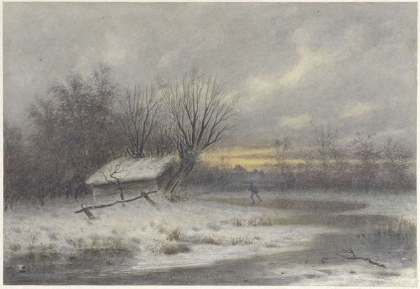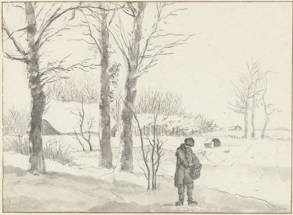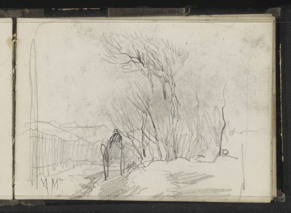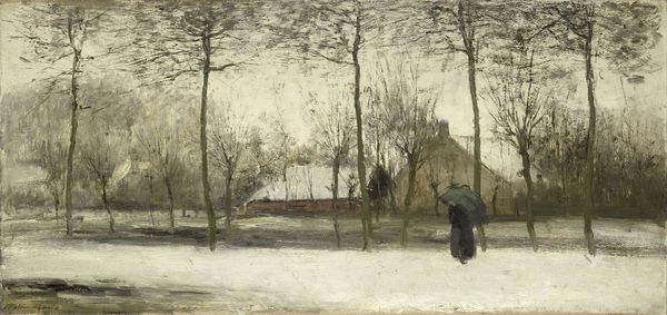 Anton Mauve made this watercolor painting, titled *Oud paar in een nieuw aangelegd park*, or *Elderly Couple in a Newly Built Park*, using watercolor on paper. Mauve masterfully captured the misty atmosphere of a parkland using fluid washes of pigment. The thinness of watercolor is key to the overall effect, creating a sense of lightness and transparency that is hard to achieve with oil paint. Look closely, and you can see how Mauve built up layers of translucent color to create depth and shadow. The fluid nature of the medium also allowed for quick, expressive strokes, perfect for capturing the fleeting effects of light and weather. The scene resonates with the social changes of the time, as parks became increasingly popular spaces for leisure and recreation among the rising middle class. The artwork's apparent simplicity belies the skill and sensitivity required to bring such a scene to life. It reminds us that even the most modest of materials can be used to create works of great beauty and emotional depth, blurring the lines between craft and fine art.