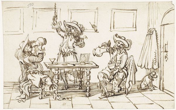 Curator: Welcome. Before us hangs an engraving whose creation has been attributed to several artists from the Dutch Golden Age, among them Cornelis Brouwer and David Vinckboons: *Oude vrouw met twee skeletten aan tafel*. Editor: What strikes me immediately is the overwhelming stillness, despite the morbid subject matter. It’s as if the engraving, in its stark black and white lines, traps this moment in eternal suspension. Curator: The piece very much participates in the “vanitas” tradition, where the focus shifts to the transience of life and the futility of earthly pleasures, wouldn’t you agree? Look closely, an elderly woman sits at a table, counting coins. On either side, skeletons patiently wait. The hourglass serves as an unambiguous memento mori. Editor: Absolutely, but let’s also observe how the composition emphasizes the interplay of textures. The soft, almost blurring rendering of the woman’s face juxtaposed against the hard, defined lines of the skeletons and even the rough woodgrain of the table creates a dynamic visual contrast. The artist uses the hatching to delineate depth. Curator: Notice how the woman clutches the coins with a determined yet almost desperate grip? Money, of course, becoming a symbolic representation of the material world that she is loath to relinquish even with death so near. Editor: But isn't there also a rather clever geometry at play? The table forms a rigid square at the base of the composition, contrasted with the curved figures and skulls—furthering this theme of conflict between stasis and motion, wealth and ruin? Curator: Exactly. The artist presents us with a potent commentary on the human condition: our inability to escape our fate, even in the midst of our most human preoccupations. The gaze of the skeletons is perhaps not threatening, but knowing. Editor: And in that quiet, inevitable observation, the true power of the print resides. A simple composition, rendered skillfully, speaks volumes about what matters, in its dark way. Curator: Precisely. The cultural weight of the artwork makes its appeal very apparent even in modern times. Editor: Thank you, a really thoughtful explanation.