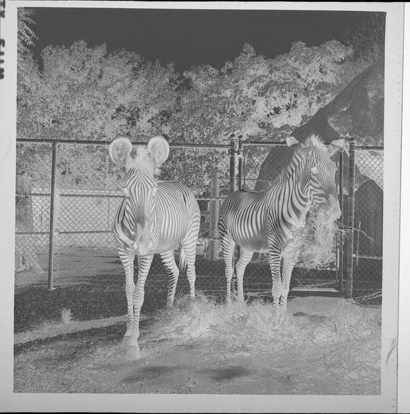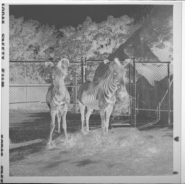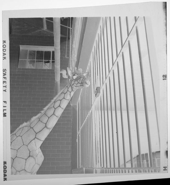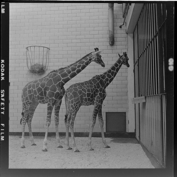 Editor: So, here we have an untitled photo, "Two Giraffes in Zoo," by Jack Gould. It's a small black and white image, and I immediately get a sense of confinement from it. What do you see in this piece that might not be obvious at first glance? Curator: You know, it's interesting. The bars create an obvious barrier, but I wonder if Gould is hinting at a more subtle kind of captivity, the way we look, observe, categorize. Editor: So, the giraffes are in a zoo, but we too are sort of viewing them from behind our own bars? Curator: Exactly. It's a little unsettling, isn't it? It's making me question who is observing whom and to what end. Editor: I hadn't thought of it that way. A bit more philosophical than just giraffes in a zoo, I guess. Curator: These kinds of photos always are, if you let them be.