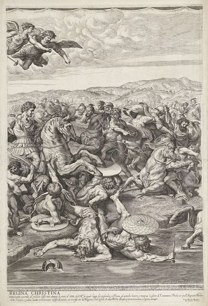 This print of the Battle of the Milvian Bridge was made around 1700 by Pietro Aquila using etching and engraving. These are both printmaking techniques that allow for detailed and reproducible images. To make an etching, a metal plate, often copper, is coated with a waxy, acid-resistant substance called a ground. The artist then draws through the ground with a sharp needle, exposing the metal. The plate is then immersed in acid, which bites into the exposed lines, creating grooves. Engraving, on the other hand, involves directly cutting lines into the metal plate with a tool called a burin. Both of these are highly skilled crafts, demanding precision and control. The dense network of lines and the subtle tonal variations show the amount of work that has gone into this piece. This print would have been made to satisfy a growing market for images. By understanding the labor and skill embedded in this image, we can appreciate the ingenuity of early modern printmaking as a craft, as well as its social context.