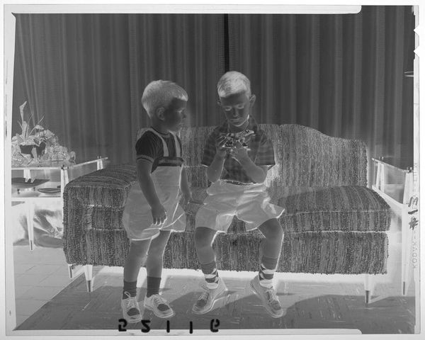 Editor: This photographic negative by Lucian and Mary Brown shows a girl and boy on a couch. The intimacy feels really powerful, but what social dynamics might be at play here? Curator: It’s interesting to view this within the history of portraiture and representation. The subjects are likely family. How does this context shift our understanding of their positioning and gaze? Consider the power dynamics inherent in familial relationships, particularly within a society grappling with issues of race and class. Editor: So, you’re saying the photograph might subtly reflect broader societal power structures? Curator: Precisely. The seemingly innocent image of children becomes a site where we can unpack assumptions about identity and belonging. What expectations are placed upon them and how do they internalize those? Editor: That makes me see it differently. It's not just a family photo, but a document reflecting societal expectations. Curator: Exactly. And perhaps even a subtle form of resistance, or assertion of identity, depending on the context. It prompts us to question the narratives we often take for granted.