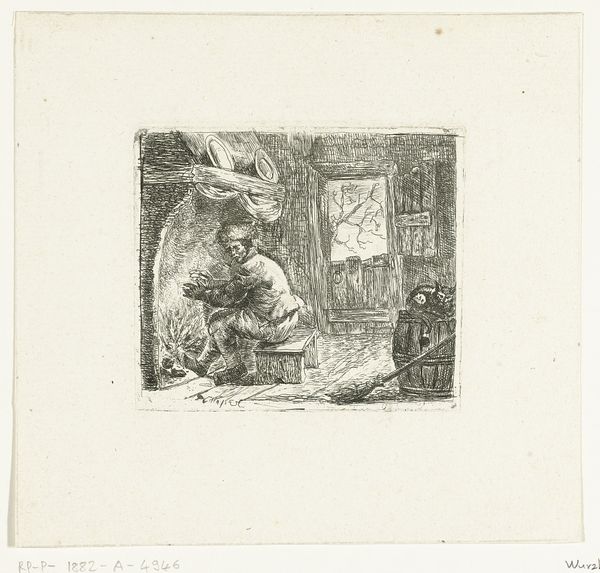 Curator: Sobering and melancholic – that’s my immediate feeling regarding this image. It looks incredibly detailed given how tiny this etching appears to be. Editor: Indeed. This is ‘Alchemist’, made possibly between 1860 and 1863 by Eberhard Cornelis Rahms. It's a compelling genre scene using etching, highlighting the textures of the depicted materials. Curator: Right. Given the subject and style, alchemy connects with broader societal structures, such as scientific development versus arcane knowledge—the very male alchemist experimenting to transform base metals into gold; but perhaps the pursuit is metaphorical too, an exploration of personal transformation given social constraints of that time. Editor: Absolutely. Note the elaborate vessel: Its structure demonstrates specific processes in refinement. We can understand the significance placed on instruments during a period grappling between emerging industrial advancements and persisting ancient crafts. Think also of the labor implied in its construction; where and by whom might it be produced, under what conditions? Curator: It reminds me of the changing societal attitude regarding the division of labor, and that period's intense interrogation of what "work" and value-production actually meant in a time where both traditional guild systems and innovative technologies struggled side-by-side. Editor: That's a keen observation. You can trace through the linework the physical and intellectual labor invested not just in the depicted practice, but also in the artistic creation of the piece. These fine lines result from a chemical reaction—acid biting into the plate. A deliberate alchemical-analog in making, so to speak! Curator: In a way, it echoes how human societies often yearn to understand, deconstruct and manipulate things within, including the sociopolitical realms. We are all in a lab of culture! Editor: I concur! Consider too, in a world before easily available image-reproduction technologies, that an etching like this brings us as close as possible to visualizing the real materiality in his process and this moment, highlighting those values for dissemination among his intended audience. Curator: And from this vantage, the alchemist may even symbolize humanity striving to reinvent reality with available and ever-changing, material means. Editor: Well articulated; each mark invites speculation of method. Every viewer is implicated in completing its value production.