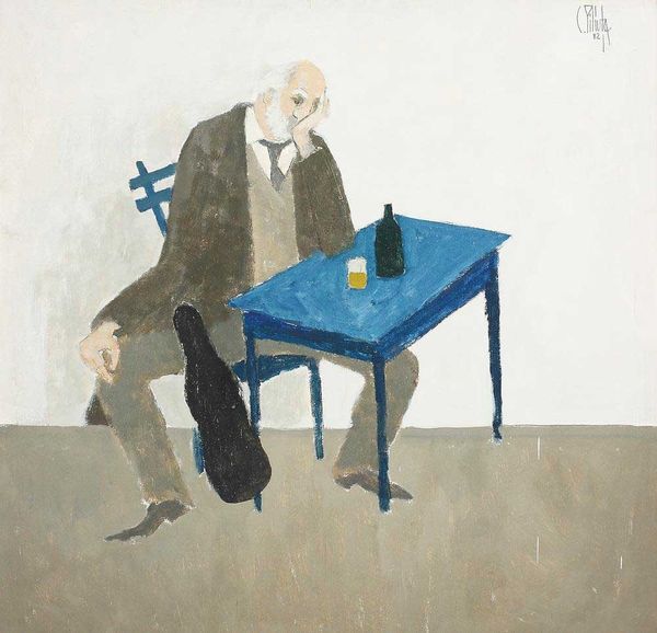 Curator: Well, look at this striking mixed-media artwork titled "Symbols Study #2" by Benny Andrews, created back in 1970. What's your initial gut reaction? Editor: It feels unsettlingly…theatrical? Like figures on a very crowded stage, almost cartoonish, yet there’s something genuinely disturbing about that wide grin. Curator: Yes! The smile does seem intentionally unsettling, even sinister against the backdrop of those oddly juxtaposed symbols. Speaking of, to me the safe, the roses, the vacant figure with the book--it reads like a checklist of classic symbols subverted somehow. Editor: Absolutely. Roses signify love, a safe represents security... But Andrews places them in a context that challenges those straightforward interpretations. The female figure is unreadable; is she complicit or oblivious? The blank expression... Curator: Right, is she reading an inventory of goods being kept in the safe, the man smirking knowing more than she? His stance atop the safe, which itself is sitting on wheels, evokes a false sense of security and an economic bubble waiting to burst. It feels intensely political, even predictive given when Andrews made it. It gives the feeling of an out of tune carnival ride. Editor: And that rug! All of that geometric abstraction, like so much noise beneath their feet...it might suggest cultural dislocation, the loss of traditional moorings. All this considered within a painting that features elements of collage… there’s a fracturing here. He's collaging symbols themselves. Curator: The mix of oil and acrylic with the pasted elements reinforces that. A disruption of expected materials adds another layer to this complex tableau. Did you say that Andrews creates theater within the viewer with such simple shapes and composition! The symbolism pulls us towards so many conflicting feelings... Editor: Exactly. I see layers and fragments: cultural anxieties expressed through archetypal forms… I appreciate its power of the social critique hidden beneath familiar images that leave more questions than answers Curator: I couldn’t agree more, there’s more questions here than any clear answers and its up to us to figure it out and perhaps question what images we associate to ideals ourselves! It really asks the viewer for introspection.