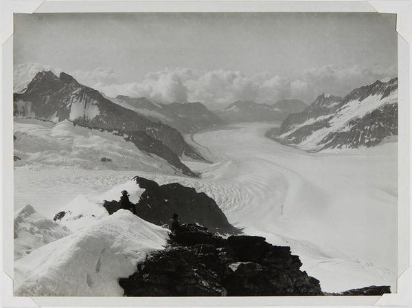 Curator: Let’s take a look at Robert Frank’s "Mountains--Landscape," a gelatin silver print he likely created sometime between 1941 and 1945. Editor: Wow, my first thought? Ethereal. It’s all monochromatic tones, like a dreamscape in shades of grey. The texture seems almost palpable, as if I could reach out and feel the cold, crisp air. Curator: Frank was, of course, interested in capturing reality, but often infused his images with a sense of detachment, a certain melancholy. Landscapes, especially mountains, have often served as symbols of permanence, the sublime, even spiritual transcendence. The mountains, especially viewed through monochrome, often trigger ideas of nature's power over humanity. Editor: It's like nature stripped down to its essence. Looking at it makes me ponder time itself. I am a fan of mountains' rough energy, a constant cycle of creation and decay. I sense both strength and fragility. It could easily reflect internal landscapes, like those jagged edges we carry inside. Curator: Exactly. This photograph echoes a period of uncertainty during the war years. Photography itself allows us to "freeze" a particular cultural moment and its symbolic valences, offering insight into human experiences, both at the individual and at the collective level. Editor: I wonder what Frank wanted to capture here beyond a record of physical space? Maybe the overwhelming sense of human insignificance we feel when we confront such natural immensity? A need to escape in such a grand, inhospitable panorama. The composition in grayscale removes distractions to direct feelings. Curator: And consider the symbolism of black and white photography, or the absence of colors. Black and white brings us face to face with the elemental oppositions that mark so much human thought: night and day, good and evil, emptiness and form. There’s a fundamental tension there that Frank masterfully evokes. Editor: I get that, the kind of tension that reminds me of waiting for daybreak on a winter mountain trek, knowing the climb is both beautiful and brutal. Makes me think how Frank maybe isn't only portraying scenery but also creating the conditions for contemplating our struggles, internal and external. What a fascinating work! Curator: Indeed, it allows us a glimpse into both a physical and psychological landscape. The emotional content of this photograph is subtly profound.
