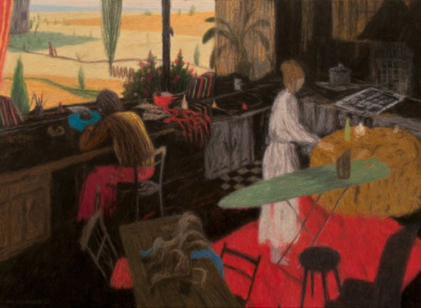Iwo Zaniewski’s “Spring Ironing” is made with what looks like pastel, maybe chalk, on paper, and it captures a moment of domestic life. It’s not trying to trick you into thinking it's real, but it’s making you feel something real. I love how the marks are so present, almost like the air in the room made visible. The colors are muted, like a memory, but there’s a kind of vibrancy too, especially in the window, and the blossom on the sill. Look at the way the window frame divides the space, the outside pushing against the inside, the softness of the garden seen through the hard geometry of the glass. It’s all these contrasts that give the piece it’s tension, it’s feeling. Thinking of other artists, I'm reminded of Pierre Bonnard and his intimate, immersive domestic interiors. Like Bonnard, Zaniewski finds beauty in the everyday, elevates the mundane. It's a reminder that art doesn't always have to shout; sometimes, it whispers.
