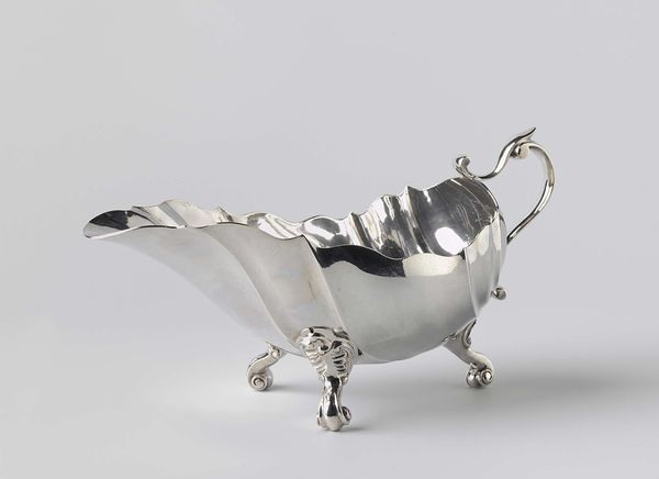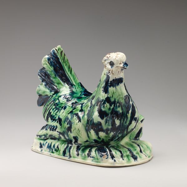 This whimsical bottle, crafted by Wistarburgh Glassworks, presents an intriguing blend of form and function. The pale green glass is molded into the shape of a quadruped, its body a rounded vessel supported by delicate legs. The piece plays with our expectations of both animal representation and utilitarian design. Note how the neck of the animal arches back to form the bottle's spout. This transformation destabilizes fixed categories; is it art, craft, or something in between? The semi-transparent glass invites light to pass through, highlighting the contours and adding a sense of lightness to the piece. The artist engages with broader philosophical questions about the nature of objects and their roles within our cultural landscape. Consider the interplay of representation and abstraction. The bottle flirts with figuration, but stops short of naturalistic depiction, encouraging us to consider the nature of representation itself.