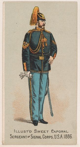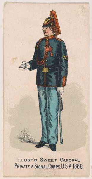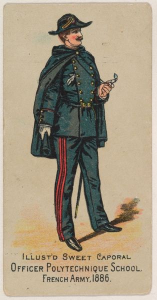 Curator: This is an advertisement card from the Kinney Tobacco Company, dating back to 1888. It is part of their "Military Series" and depicts a "Gendarme, French Army, 1886." These were promotional inserts for Sweet Caporal Cigarettes. Editor: Well, my initial reaction is… quite stylized. There’s a certain theatricality in the rendering, an exaggeration in the posture and uniform that suggests a performance. It's not necessarily naturalistic. Curator: Indeed. Think about how military imagery was utilized and consumed in the late 19th century. These cards were mass-produced; miniature portraits intended to romanticize the army. They fostered a certain sense of national pride and perhaps contributed to the normalization of military service. Editor: Precisely, that's what I find interesting! This seemingly innocuous card acts as a vector of ideology. The soldier, though generic in appearance, becomes a symbol. And let's consider how the soldier is not rendered neutrally. It veers almost into caricature, raising questions about the underlying societal attitudes towards military personnel, or perhaps French militarism. Curator: That hint of caricature, I believe, is less about ridiculing the soldier and more about emphasizing recognizable “types”. There's a performative aspect of national identity at play, packaging France itself into a commodity. Also note the company—a tobacco brand co-opting a symbol of French power! The convergence reveals the interwoven relationships between military strength, cultural identity, and capitalism. Editor: And the potential power dynamics. Were these images targeting specifically male audiences, implicitly or explicitly? The normalization of smoking habits could, in turn, have further social consequences connected to class and gender at that time. It's important that the artwork is not detached from its social ramifications. Curator: Absolutely. Furthermore, Kinney Tobacco wasn’t simply an art patron. They benefited financially. We must remember such companies heavily influenced and steered aesthetic and political representation of not only the subject of French gendarmes, but France itself! Editor: Thinking about its original context, the mass circulation is critical. A cigarette card becomes a potent instrument shaping national and social attitudes, intertwining concepts of national pride, military personnel, and commodification of masculinity. Curator: Studying "Gendarme, French Army, 1886", reminds us of the political narratives inherently enmeshed within popular art. The piece asks that we consider the mechanisms and intent that are central to this representation. Editor: I'd concur! It underscores how critical reflection, even of the smallest pieces, reveals powerful insight in the social construction of identity, nationhood, and commodity culture.