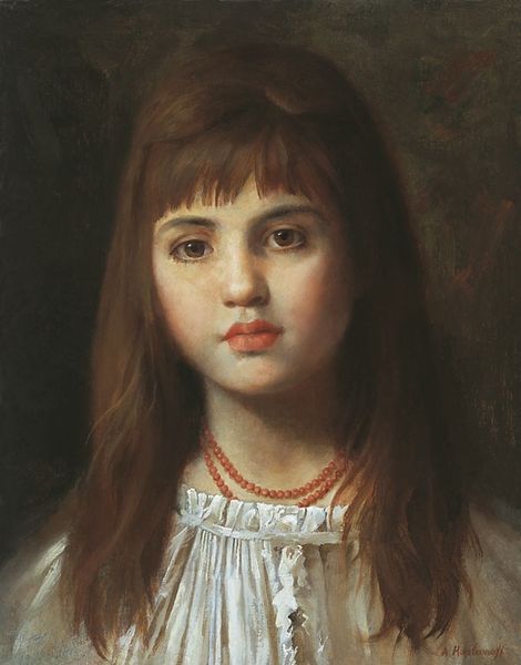 Alexei Harlamoff’s ‘Young Girl with a Pearl Necklace’ captivates through its delicate rendering and subtle tonal contrasts. The girl’s pale skin is juxtaposed against a dark, undefined background, pulling the viewer’s gaze towards her contemplative expression. Harlamoff masterfully uses the interplay of light and shadow to model the girl’s face, lending a soft three-dimensionality. The pearl necklace, the focal point of the painting, catches the light, drawing attention to her youth and innocence. These elements work together to evoke a sense of melancholic beauty, characteristic of late 19th-century portraiture. The composition invites contemplation on the themes of youth, beauty, and the fleeting nature of time. The girl's direct gaze challenges the viewer, inviting a personal connection and prompting reflections on the artwork's emotional depth. The pearl necklace serves as a marker of social status, yet it is her gaze that conveys meaning beyond societal constraints.