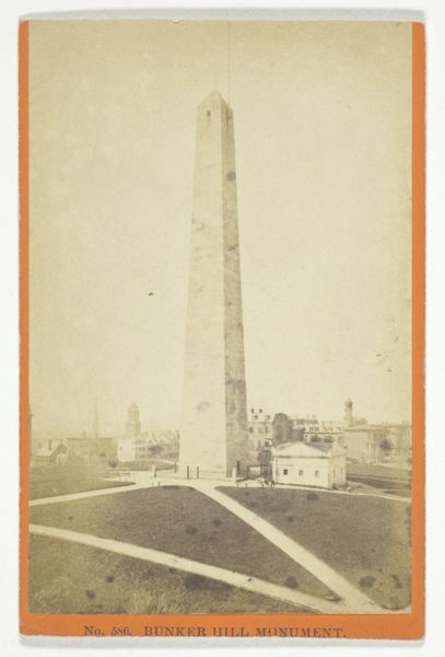Curator: The Ochterlony Monument, Calcutta captured in the 1850s by Captain R. B. Hill, and now residing here at the Met. What a stark composition, isn't it? Editor: It has this uncanny stillness... like a held breath before a storm. Curator: Tell me more. Editor: Well, the monument dominates the landscape, yet feels strangely isolated. A relic towering above a vast expanse... reminds me a little too much of colonial dominance frozen in time. Curator: Precisely. This print—created through photography—presents an architectural scene and really offers us a view into British colonial India, particularly through monuments designed to reinforce power structures. It almost begs us to dissect its symbolism. Editor: Right, a photograph preserving this physical symbol, Ochterlony's monument, commemorates a British General, a celebration of victory, all etched into this space and frozen within the sepia tones of the photograph. It’s not just a pretty cityscape. It carries so much weight. Curator: And that’s the paradox, isn't it? What seems simple – a column rising above a plain – unravels when we unpack its layers. Editor: Absolutely. And beyond the overt symbolism, what do you think the image *wants* us to feel? Do we sense a longing? Is this emptiness an appeal, an admonishment? I wonder. Curator: Hmmm... perhaps that sense of stillness, of solitude, echoes a certain ambivalence about legacies—triumphs, certainly, but at what cost, and to whom? Maybe its legacy also encourages that introspection. Editor: A powerful piece indeed. It leaves one wrestling with the echoes of history and its visible imprints, right here. Curator: Indeed. The shadows of time play out on every monument— and photograph. A picture truly speaks a thousand loaded words, as they say.
