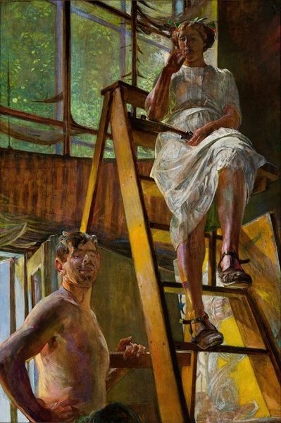Editor: John Singer Sargent's "Marionettes," painted in 1903, is rendered in oil paint. The painting depicts figures operating puppets. It's intriguing how Sargent captures the puppeteers almost as characters themselves, and I immediately thought, who's controlling whom? What's your take? Curator: It's tempting to view it purely as a genre painting, a snapshot of entertainment. But Sargent, sly dog that he was, is definitely nudging us towards something deeper, isn't he? It makes me think of my own experience. Sometimes I wonder, are we the puppets of societal expectations, dangling from the strings of family or career? Doesn’t this composition also create an interesting layering of gazes, drawing the viewer into the spectacle while making one ponder artifice and reality? Editor: Absolutely. I see the layers! It is thought-provoking how easily we get caught up in performances of our own. But did Sargent intend this level of symbolism, or is it just us projecting meaning? Curator: I wager Sargent was consciously exploring that tension between outward show and inner life, subtly revealing what's behind the curtains. And maybe there’s humor there, a gentle ribbing about the human condition and its reliance on theatre. Editor: A gently humorous jab. So, we're left pondering whether we're the audience, the puppet, or maybe even the puppeteer in our own lives. It gives you a lot to consider. Curator: Indeed! Every time I revisit this, I find myself searching for new faces lurking in the shadows, more actors in this grand performance.