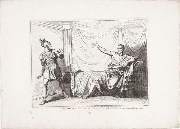 Curator: Oh, this print. I’m immediately drawn in, it feels like I’ve stumbled upon a secret, a hushed moment brimming with intrigue. Editor: Here we have an engraving titled "Episode uit het leven van Frans I," or "Episode from the life of Francis I," created sometime between 1822 and 1880 by Reinier Craeyvanger. Curator: Engravings always get me—that intricate network of lines, all those tiny decisions adding up to such drama. And the way the light sort of clings to Francis's robes, he looks terribly important. Though I'm getting second-hand anxiety from the letter abandoned on the floor. Editor: It's an excellent example of how artists in the 19th century continued to utilize printmaking to disseminate historical narratives, ensuring they reached a broad audience, shaped by contemporary views on history and politics, especially the interest in French royalty which was undergoing something of a Romantic revision at this time. Curator: So, almost like a carefully curated historical headline? Less objective truth, more about sparking interest and maybe even influencing public opinion? It’s interesting how it seems to capture a moment frozen in time, with a hint of theatrics, like a play set. Editor: Exactly. The staging here isn't accidental. Observe how the characters are positioned relative to the background. It subtly influences the viewer, suggesting that there's a performative element at play – the staging, lighting, clothing, and set pieces construct meaning just as powerfully as the figures do. Curator: Right! And that sense of melodrama feels deliberate – almost like we, the viewers, are meant to be in on the secret, judging their choices. Although who are we to judge the choices of dead royalty, anyway? Still I wonder: who left the note behind and who might have read it? Editor: That ambiguity keeps us engaged and speculating long after we walk away, which, I suspect, was very much the intention. An intriguing snapshot of both then and, in its layered narrative, something about now, too. Curator: Well, after looking and chatting about this engraving, I think the mystery surrounding "Episode uit het leven van Frans I" is something you need to think about over tea! Editor: Absolutely. History with a dash of delicious speculation – a great combination, if I say so myself!