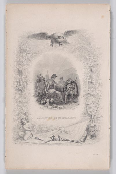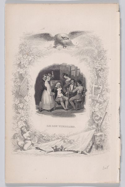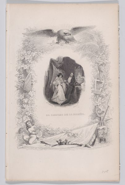 Achille Désiré Lefèvre created this print called "Passing Young Girls" from The Songs of Béranger. The design of the print is immediately striking. Note the ornate floral border, which creates a frame for the central scene. At the top is an eagle, and at the bottom, Cupid kneels beside discarded symbols of royalty. This composition creates a symbolic interplay. The floral border, a classical motif, contrasts with the revolutionary context suggested by the broken crown and scepter. Lefèvre seems to be using a semiotic system that mixes classical allusions with contemporary political commentary. The technique used allows for fine details and textures, which adds to the visual complexity and invites closer inspection. The artist employs a formal structure of contrasts to explore themes of power, change, and cultural memory. The print invites viewers to interpret its symbols, without ever arriving at a fixed or singular meaning.
