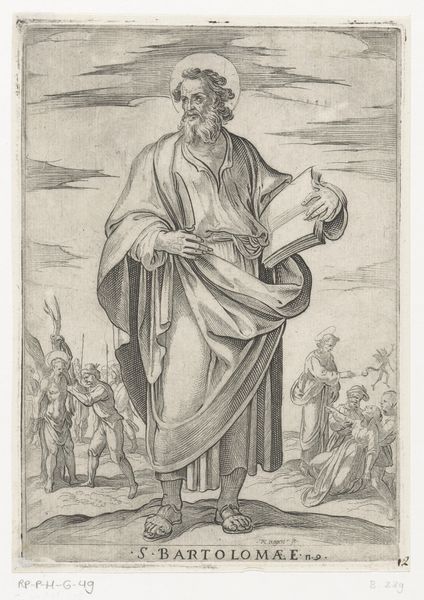 Editor: So, this engraving, "De heilige Petrus," created sometime between 1565 and 1630 by Antonio Tempesta, is striking. The line work feels so deliberate. What do you see when you look at this print? Curator: Considering the materials—the copper plate, the ink, the paper—and the engraving process, it's vital to recognize this isn't just a portrait, but a manufactured object designed for dissemination. Look at how the marks build the form of St. Peter and his attributes – the book, the keys. The making is central to the work's meaning. Do you see evidence of mass production impacting the artistry itself? Editor: Well, the uniformity of the line weight suggests efficiency, maybe pointing toward the demands of producing multiples. Does that devalue the artistic skill? Curator: Not necessarily devalue, but re-contextualize it. The value shifts from unique artistic touch to skillful reproduction and accessibility. This was likely made to meet religious demand or reinforce certain ideologies through readily available images. Also, the materials available influence production values, changing what art meant to a society. What do you think about the way materials shaped its cultural meaning? Editor: That's fascinating. The accessibility allowed for widespread dissemination of this imagery. So it becomes about more than just the image itself, it's about its function and consumption in society. Thank you! Curator: Exactly! Considering the economic and social networks involved, the value lies in understanding the networks that create these objects and how they interact to serve and reinforce a range of social purposes. Now, seeing all of this changes your perception, right?