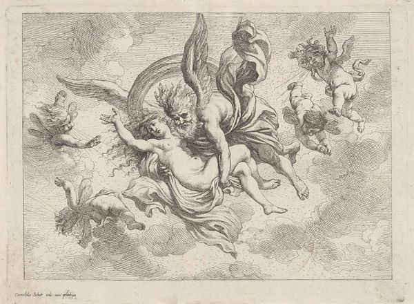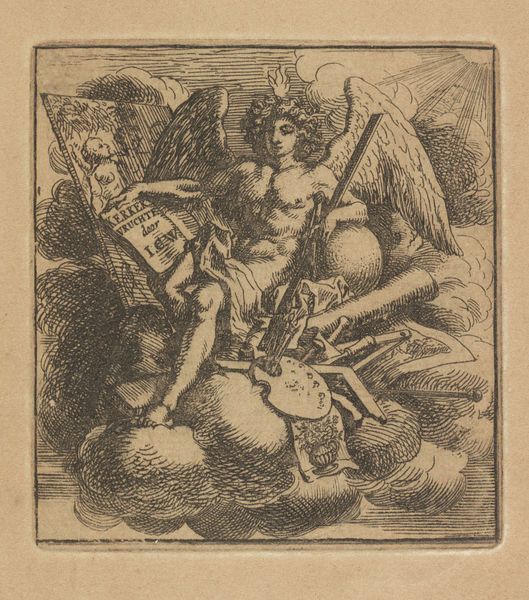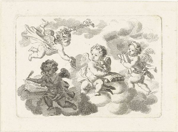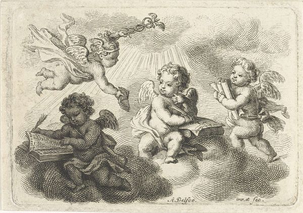 Abraham Delfos created this print, "Vier putti als personificaties van kunsten en wetenschappen," sometime in the 18th century. It shows four cherubic putti who embody the arts and sciences, and it's fascinating to consider this work in its historical context. The 18th century was a time of profound social and intellectual change; the enlightenment was changing the way people thought about the world. The focus on reason and empirical knowledge often excluded women and people of color. How could their contributions to the arts and sciences be included in a world that refused to recognize them? Delfos’s choice to depict these concepts through cherubic figures offers a softer, more accessible interpretation of enlightenment ideals. The emotional resonance of this choice invites us to think about the humanistic side of the enlightenment. While these figures are ostensibly genderless, the symbolism and imagery used in the print reflect a very specific understanding of gender, race, and class. This print encourages us to consider how these idealized forms of art and science can reflect societal biases or open pathways to a more inclusive vision.
