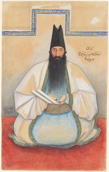 This is a portrait of a statesman by Yahya Ghaffari, dating from the later 19th century, made with opaque watercolour, ink and gold on paper. It's a meticulous work, not just in the rendering of the subject, but in the depiction of his clothing. His patterned robe immediately suggests the global trade in textiles that was underway at this time. The pattern may even be a precursor to paisley, derived from Kashmir shawls that were highly desirable in Europe. The very fact that the statesman is wearing such an item speaks volumes about his position in society, as does his bejeweled adornment. The amount of labor involved in this type of painting should not be underestimated. Each detail would have required countless hours of dedicated work, building up layers of pigment to achieve the desired effect. By focusing on the making of this image, we can better appreciate its cultural and historical significance, challenging our assumptions about the hierarchy of art and craft.