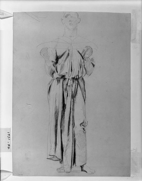Curator: What strikes me immediately is the somber grandeur. The monochrome palette almost mutes the elaborate details, creating this ghost-like vision of a past era. Editor: Indeed. This is a photographic representation of a “Dinner Dress” created by the House of Worth, dating from 1872 to 1882. The original, housed at the Metropolitan Museum of Art, speaks volumes about the period’s social structures. Curator: Absolutely. You can practically hear the rustling of silk and sense the constraints placed upon women of that era by its very structure! The long train, the fitted bodice, it's all about presentation and adherence to strict social norms. Editor: It’s a powerful study in contrasts, actually. Despite being rendered in a single tone, the textures—the floral pattern of the fabric, the fringed edges—create an intricate visual dance. Note how the light plays across the material, defining the very form of the dress. Curator: And form dictated function in that period. The House of Worth became synonymous with haute couture, dressing empresses and socialites. The dress exemplifies their influence in shaping not just fashion, but also perceptions of femininity and status. Editor: One can analyze it as a study of vertical lines, too. From the high neckline down to the trailing hem, our eyes are compelled to follow the dress’s monumental form. It's imposing, even without a wearer. Curator: Right, because these dresses acted as tools—instruments of power and visual messaging, particularly for women in privileged social echelons navigating a male-dominated society. Editor: It certainly allows a perspective from the structure's standpoint. Its intricate composition and its monochrome photography render its very historical message in an ageless, modern way. Curator: Looking at this image has revealed so much about societal constraints and visual communication during this period. The dress functions almost as a silent protest to these very pressures. Editor: Yes, a profound study of form and societal structure, caught in this play of monochrome light. It truly captures a world within its delicate textures.