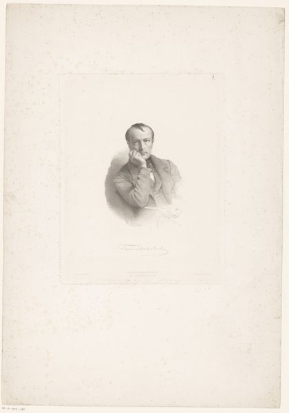 Curator: Standing before us is a pencil drawing from around the 19th century by David Octavius Hill, entitled “John Gibson Lockhart.” Editor: My immediate impression is one of austerity. The severe profile, the stark collar – it speaks of restraint and intellect, no? Curator: Absolutely. Hill's strategic use of light is particularly noteworthy. The chiaroscuro effect focuses the gaze directly on Lockhart's face. This tight control of tone guides our interpretation of the subject, amplifying the planes of the face and underscoring what might be deemed intellectual rigor. Editor: Considering Lockhart was a prominent literary figure and editor himself, one can presume that's entirely the point. Think of the impact of figures like him had in shaping cultural discourse! The composition serves to immortalize and ennoble, really, presenting him to posterity. It does, in many ways, perform cultural work. Curator: Indeed. Also, note the economy of line. Hill manages to convey a wealth of information with minimal strokes. The subtle gradations of shadow create depth and volume. This simplification allows the essential form to dominate. It's about a type, a social category perhaps, reduced to a formal elegance. Editor: And there's also an inherent paradox here, don’t you think? This intimacy of a drawn portrait, and the fact of its making is placed on a public figure to be displayed at the institute. Consider, as well, the role portraiture played at a time of growing media development and changing conceptions of visual culture. Curator: That contrast between personal study and public declaration highlights an interesting tension. It prompts us to consider the different modalities of seeing inherent in viewing art across time. Editor: It also causes me to contemplate who Lockhart, and by extension, Hill thought that they were performing for, beyond themselves. Curator: These formal choices and contextual considerations surely grant us a deeper engagement with Hill's image of Lockhart.