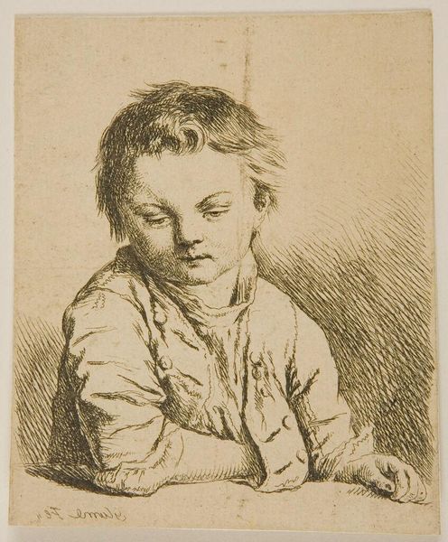 Editor: Georg Friedrich Schmidt's "Head of a Child" has such tenderness. I am struck by its intimate scale and the soft, reddish tones. What visual metaphors do you think this piece evokes? Curator: The child’s averted gaze, rendered in sanguine, speaks to innocence and perhaps vulnerability. The hatching technique, reminiscent of early engravings, imbues the work with a sense of history and fragility. Do you see any other symbols? Editor: Perhaps the flowing hair hints at freedom, contrasting with the tight control of the lines. Curator: Precisely. The artist uses familiar visual vocabulary to evoke universal feelings about childhood. Understanding these images helps us connect across time. Editor: I never thought of it that way. It's fascinating how those enduring symbols still resonate. Curator: Indeed, and appreciating this continuity enriches our experience of the artwork.