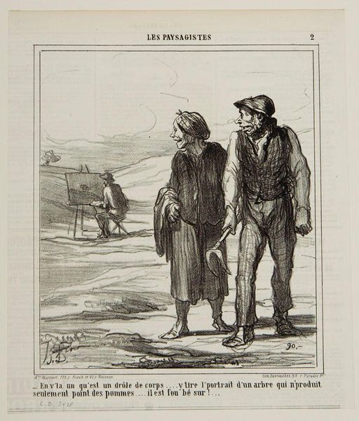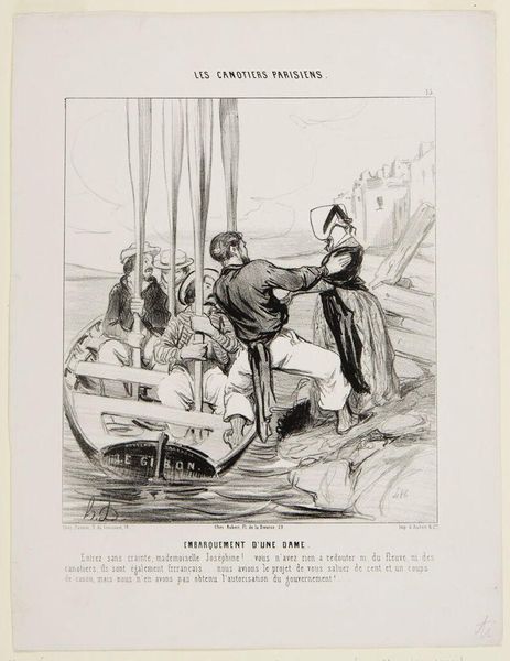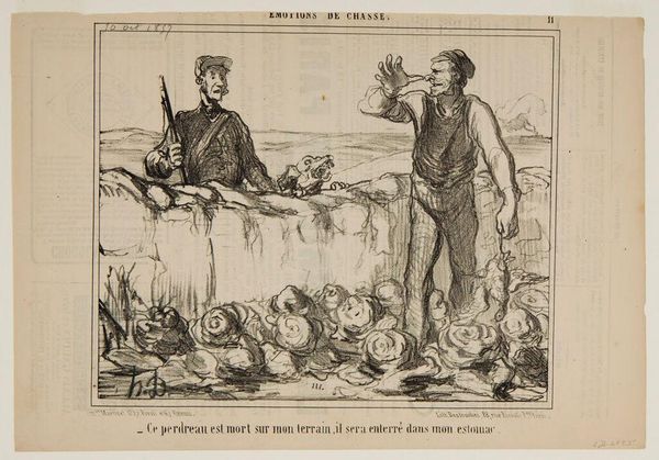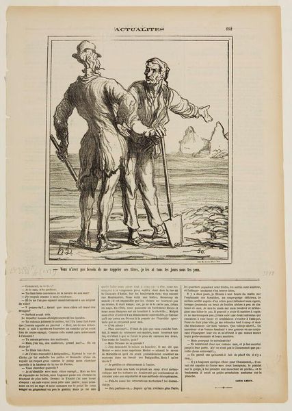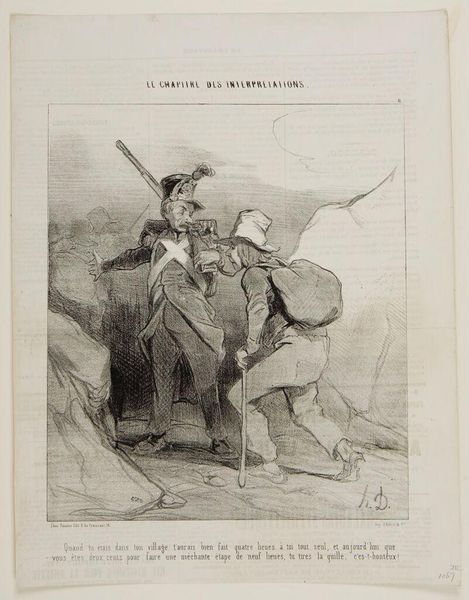 Curator: This is Honoré Daumier's "You shouldn't have gotten so familiar, I'm within my rights!..." It looks to be a lithograph. The title itself hints at a confrontation. Editor: It feels brutal. There is such raw emotion in the figures; the drama is palpable. It makes me consider issues of power and class. Curator: Daumier often used his art to critique the social and political landscape of 19th-century France. His prints were widely circulated through newspapers. Editor: Absolutely. The very medium speaks to its accessibility and its potential to catalyze public opinion. The language is aggressive. Curator: And this piece underscores how personal honor, class dynamics, and perhaps even legal justifications were intertwined in everyday conflicts. Editor: It’s a potent reminder that inequality and power imbalances can quickly escalate into physical altercations, reflecting deeper systemic issues. Curator: Yes, a sentiment as relevant then as it remains today. Editor: Indeed, it forces us to reflect on whose rights are protected and whose are violated.