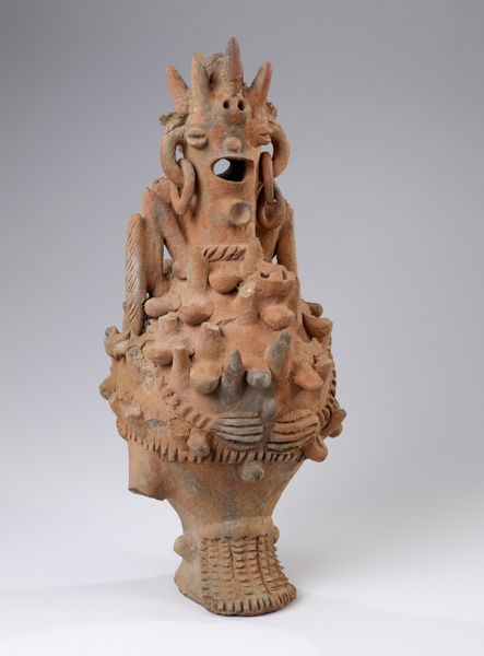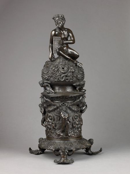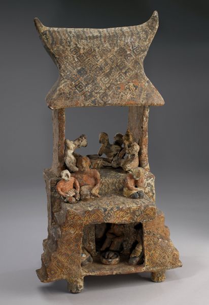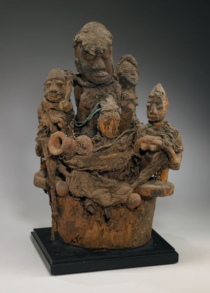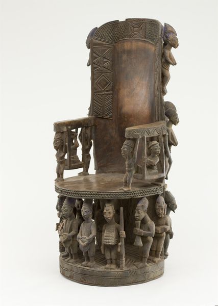 Curator: Here we have an Altar Stool, crafted by the Yoruba people, dating from the mid- to late 19th century. It's a wood carving, a relief sculpture featuring figuration and group portraits. Editor: It strikes me immediately with its somber tone and cylindrical structure, not unlike a miniature stage set. The turned wood is incredibly dense. Curator: Indeed. Consider how the composition directs our gaze— the upper register of the platform featuring a circular pattern leads to the carved figures surrounding its base. These support figures appear to represent a community, perhaps attending to a ritual or narrative scene displayed in the bottom. Editor: Absolutely, it is teeming with symbols of power and social roles. The central figure wears an elaborate headpiece and regalia, suggesting leadership, while the lower prostrate figure signifies perhaps sacrifice, tribute, or healing. The objects and postures tell us so much. Curator: I find the negative space crucial too; it defines the figures, emphasizing their relationship and delineating forms that enhance its structural integrity. The rhythm established through the repetition of carved shapes contributes to its presence. Editor: I see the rhythmic balance you note, but for me, its deeper story, these visible clues, is what calls. Look at the others bearing witness. They have these ceremonial roles as the narrative unfolds beneath them, this silent and powerful tableau. Curator: I concede to the layered meaning inherent, especially in this configuration and symbolic use of gesture. The craftsman employed formal means to communicate an even wider cultural narrative. Editor: Agreed, from the symbolism to its structural elements, this unassuming stool carries remarkable symbolic weight. Curator: It has shown us today how an analysis of form and semiotic readings coalesce to enrich our understanding of art. Editor: Illuminating a cultural memory, as art has always sought to do.
