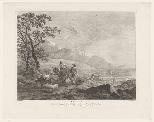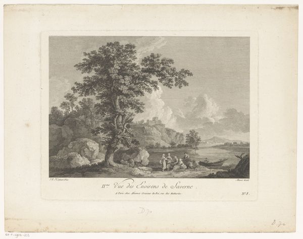 Editor: So, this is "Reizigers in een landschap," or "Travellers in a Landscape," by Jacques Aliamet, made sometime between 1750 and 1788. It's an engraving, currently residing at the Rijksmuseum. It gives me a sort of pensive, pastoral feeling... What do you make of it? Curator: Pensive is spot on! It evokes, for me, a fleeting moment—a hushed tableau lifted straight from an 18th-century diary entry. Can you imagine their conversation? Are they weary wanderers, or are they triumphant returnees? The rolling landscape teases us; it suggests both possibility and the inevitable vastness that lays just beyond our grasp. Editor: I hadn't really thought about where they're headed! It seems a world away from our own. Curator: Doesn't it? Think of this period. Engravings were about dissemination. Reproducing other artworks allowed them to live in countless homes. Aliamet, using the burin, wasn't just copying an image; he was channeling an atmosphere, almost curating a mood for widespread consumption. The almost frenetic detail in the foliage suggests a raw, immediate response to nature, wouldn't you agree? Editor: It's like each blade of grass has its own story. Curator: Exactly! Do you see that lone tree on the left, reaching, almost aching, towards the dramatic sky? Editor: Yes! Curator: To me, that’s where the true emotion resides. It’s a silent dialogue between the earthly and the divine, between our small selves and the grand scheme. Editor: That gives me a new appreciation for engravings; I saw them as replications, but there is interpretation, intention, in the art as well. Curator: It's always hiding in the details, if you look closely. The art of the journey captured on a plate.