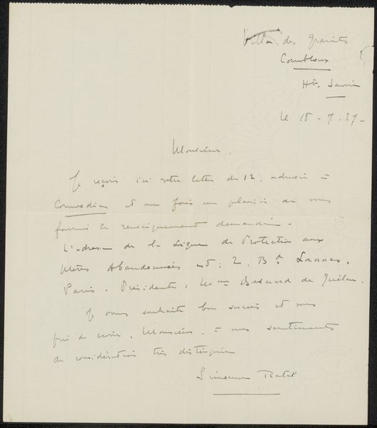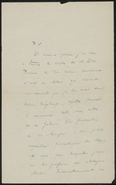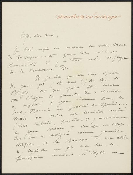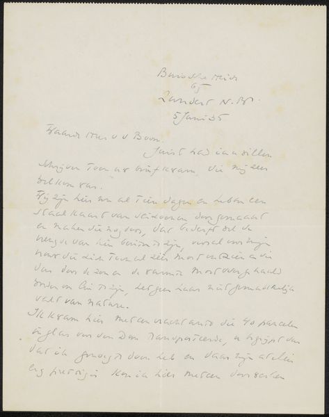 Editor: Here we have "Brief aan Willem Bogtman," potentially from 1936 or 1937, by Richard Nicolaüs Roland Holst, using ink on paper. It looks like a handwritten letter or personal note. The cursive script and slightly faded ink give it an intimate, almost ephemeral quality. What strikes you most about this piece? Curator: What grabs me is its grounding in the specifics of time and place, "19 Juli 36, Brussels Heier, Zundert." Yet, the personal tone creates a push-pull effect. Holst, deeply involved in socialist movements, especially within the Dutch artistic community, crafts a piece that seems simultaneously a private correspondence and potentially a reflection on his public engagement. How do you think his social activism informs something as intimate as a letter? Editor: That’s interesting! I hadn’t considered the connection to his activism. Perhaps this letter offers a glimpse into his network, a way of maintaining connections within the artistic and political circles he was involved in? Curator: Precisely. We could see the act of letter-writing itself as a form of quiet resistance, fostering solidarity during politically turbulent times. Even the handwriting, its legibility challenged by its aesthetic flair, plays into this tension between accessibility and exclusivity. Editor: So, it’s not just a personal note but a cultural artifact that speaks to the artist’s broader social concerns? Curator: Exactly. Holst, though known for symbolist leanings, was always politically engaged. By situating the artwork in the intersection of private life and public action, it reframes intimism within a broader historical and social dialogue. Editor: I’m starting to see it now. I initially viewed it as just a personal item, but knowing the background helps uncover deeper layers. Thanks! Curator: My pleasure. These types of personal writings often reveal insights we don't necessarily pick up on in gallery artworks!