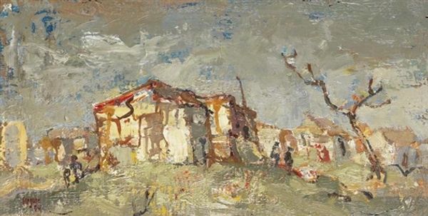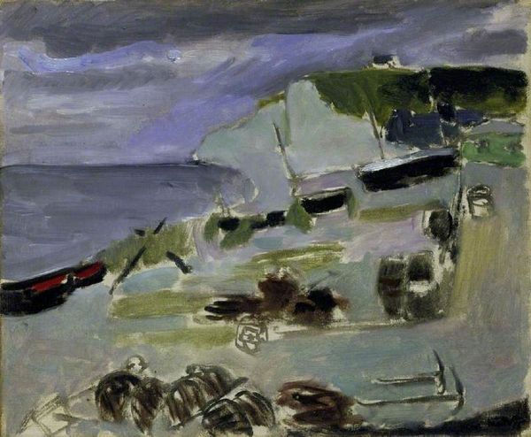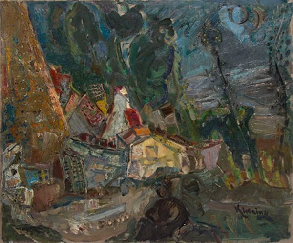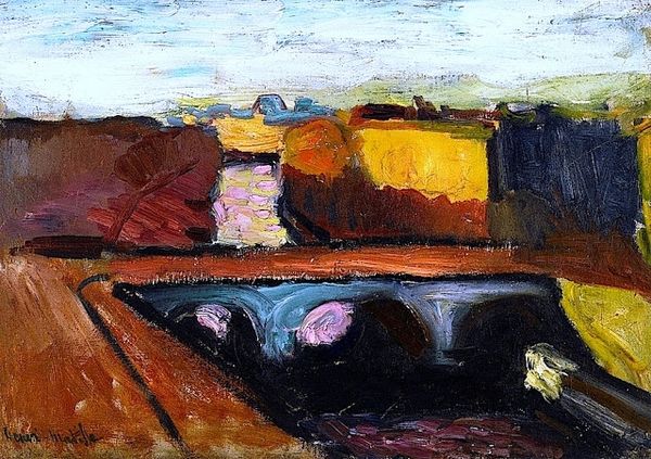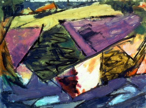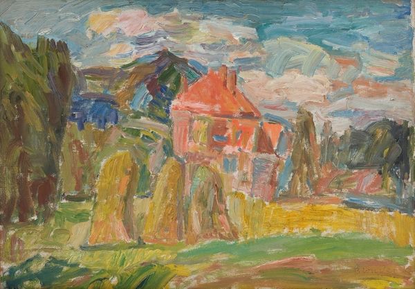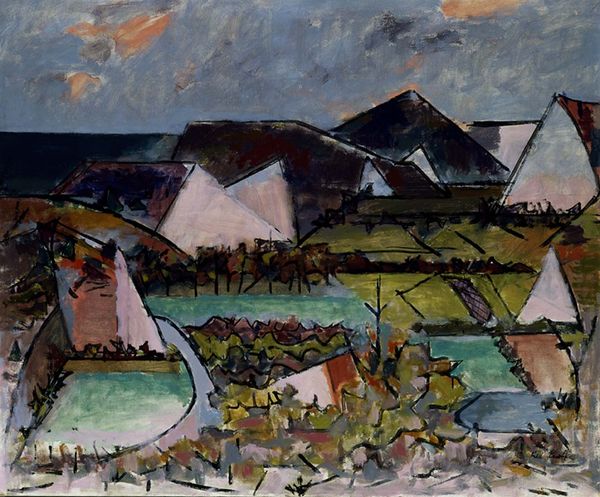 Curator: Welcome! Today, we’re looking at "Working the Field" by Constant Permeke. It's an oil painting, executed with impasto and in plein-air style, typical of his expressionistic landscapes. Editor: It's... brooding. Those heavy, earthy colours—greens, reds, and browns—create a palpable sense of weight. And the thick impasto makes everything feel so dense and tangible. It almost feels oppressive, really. Curator: Precisely. The density underscores Permeke's stylistic focus: an emphasis on materiality and formal construction. Note the flattened perspective and simplified forms; the cottages, hills, and sky are all reduced to fundamental geometric shapes. Observe, too, the lack of detailing. Editor: The absence of detail only amplifies its intensity. This landscape isn't just a visual scene, it’s a depiction of manual labour, which permeates throughout the visual narrative. How do you think Permeke's own socioeconomic background may have contributed to his perspective of rural life and labor? Curator: Ah, that reading falls beyond purely aesthetic concerns. Though I agree we see an idealisation of form. These weighty, monolithic blocks of color construct a self-contained reality rooted not so much in an authentic landscape experience, but in the purely material qualities of the medium. Editor: Yet the social and historical context informs that materiality. The brushstrokes themselves, laid down so heavily, can be interpreted as embodying the weight and strenuousness of manual labour. The dark colour palette feels almost claustrophobic, representing the limited opportunities and hardships faced by rural workers. Curator: True, and perhaps Permeke’s aesthetic rendering translates to broader symbolic interpretations – about mankind and nature for example. What remains fascinating to me, however, is how that vision of "Working the Field" creates this powerfully affective visual experience through fundamentally artistic choices of form, color, and application. Editor: And ultimately, understanding both allows for a more meaningful encounter with the artwork. Curator: Precisely! I'm glad we could reflect on both the construction and potential interpretation of Permeke’s ‘Working the Field’ here today. Editor: Absolutely! Hopefully, we’ve helped illuminate how those contextual influences resonate in art and create opportunities for cultural reflection.