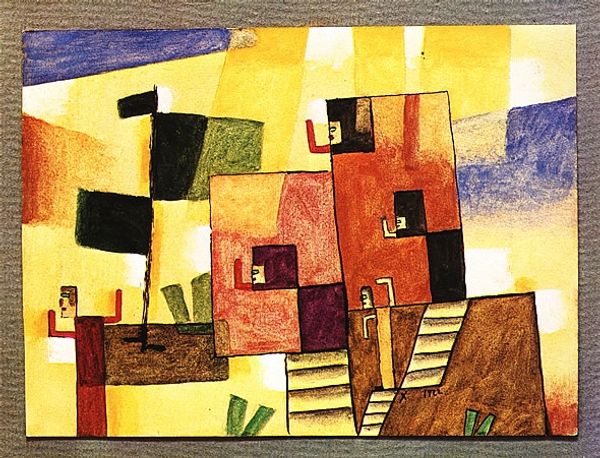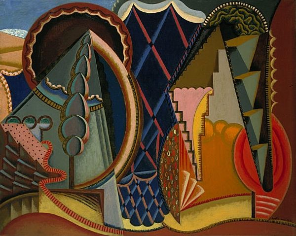 Curator: Pablo Picasso created this oil-paint rendering, titled “Landscape of Juan-les-Pins”, around 1920. Editor: It strikes me as quite playful. The composition, despite being rooted in Cubism, has a naive charm. It almost feels like a stage set. Curator: Given Picasso's engagement with Synthetic Cubism at this time, he would be dissecting visual elements into distinct forms. It seems less about faithful representation and more about exploring new relationships between materials, production and forms of building in the post-war. Editor: Absolutely. The fractured perspective disrupts any sense of traditional depth. But doesn't that very act redefine landscape art as an active socio-political space? Think about it: The rise of urbanization and modern leisure clashed with nature's supposed harmony in early 20th-century culture. Curator: I agree the fractured nature has a strong political sense for the era it came from, you can see that process in his previous works leading up to this one. He would dissect an image into its most necessary element, allowing only those specific markers that make up space to be represented in his paintings, creating a type of “graphic” version of life around him. Editor: It’s more than just geometric abstraction though, don't you think? Note the raw handling of the materials. There’s a very visible texture to the application. That roughness gives it a directness. As if challenging established ideas on labor, making or production for modern forms of artistry, as if trying to make an avant-garde argument. Curator: That is true, the materiality here gives the impression he wants to emphasize not only what a place or scene consists of in its minimal components, but that this minimal image can still convey a complete view of this place or even challenge others to perceive things beyond what meets the eye. Editor: This really gives me pause to wonder, what was the place for nature as a political symbol during the peak of industrialization, but more importantly what role could the artist fulfill to give visibility to their own modern perception of their environment? Curator: In the end, Picasso seems intent on disrupting any easy consumption of established artistic tropes, both materially and visually, don't you agree? Editor: Absolutely! I’ll certainly think differently the next time I encounter this painting. It reveals so much about the socio-cultural role landscape and leisure can play in shaping art.