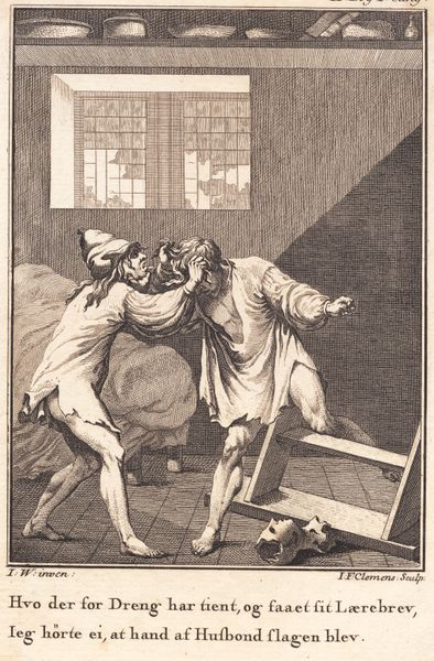 Georg Christian Schule created this title vignette for Smollett’s "Peregrine Pickles Tildragelser" using engraving techniques. The image plunges us into a scene of abduction, laden with the visual codes of its time. Made in late 18th-century Denmark, the artwork provides insight into the period's social mores and the representation of class dynamics. Consider the architecture and dress, signalling social standing. One man carries a woman over his shoulder, while another seems to assist or perhaps even instigate the act. Is this a commentary on social mobility, or a satire of contemporary power structures? To fully understand this vignette, research into the period’s reception of Smollett's work, as well as the social function of Danish book illustration, would be invaluable. Only then can we truly interpret its message and its place within the cultural landscape of its time.