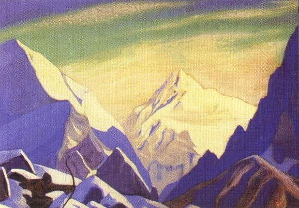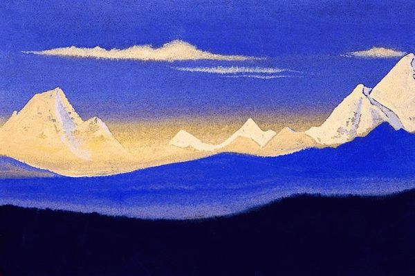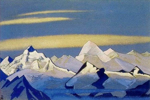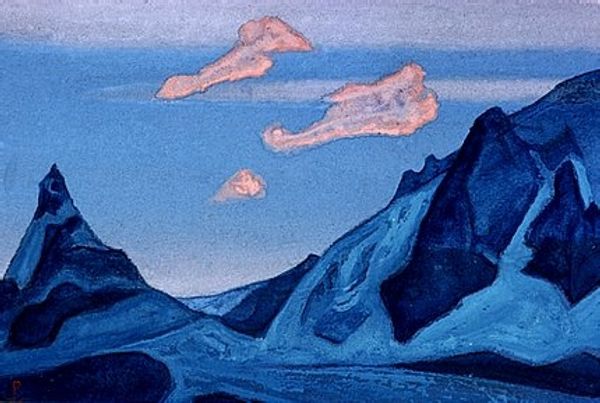 Nicholas Roerich, a Russian artist, painted "Tibet" using tempera on canvas. Roerich was deeply involved in the spiritual and cultural movements of his time, particularly Theosophy, which sought to uncover universal truths across different religions. His travels through Asia, including Tibet, were not just geographical explorations but also spiritual quests. This painting reflects a romantic, almost mystical view of the region, emphasizing its serene and timeless quality. The cool blues and purples evoke a sense of peace and the sublime, yet the shadows cast on the mountains hint at an unknowable depth. Roerich's work exists in a complicated space, influenced by both genuine admiration for Eastern cultures and the Orientalist tendencies of his era. He sought to capture the spiritual essence of Tibet, presenting it as a sanctuary untouched by Western materialism. This painting serves as a reminder of how cultural and spiritual seeking is often intertwined with personal and historical perspectives, reflecting both the beauty and the complexities of cross-cultural encounters.