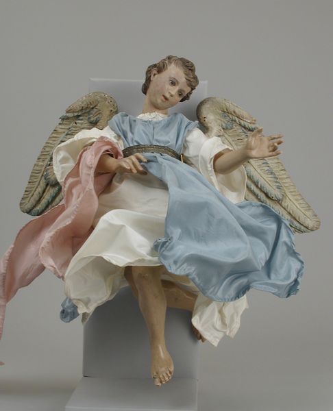 Giuseppe Sanmartino crafted this Angel from terracotta, wood, and cloth in the 18th century. The sculpture's most striking feature is the juxtaposition of materials. The terracotta and wood provide a solid, grounded structure for the figure, while the addition of cloth adds a layer of realism, softening its appearance. The materiality influences its appearance, imbuing the artwork with social and cultural significance. Sanmartino engaged with skilled traditions of sculpture and textile work. The creation of this artwork involved not only sculpting and carving but also the selection, manipulation, and arrangement of fabrics to create the angel's robes, with an incredible amount of work involved in its production. Ultimately, considering the materials, making, and context allows a fuller understanding of this artwork, challenging the distinction between fine art and craft.
