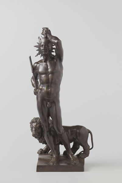 Curator: Here we have "Pluto and Cerberus," a bronze sculpture crafted between 1600 and 1615 by Giovanni Battista di Jacopo, presently housed at the Metropolitan Museum of Art. Editor: My initial impression is one of striking dynamism contained within a relatively small scale. The artist’s manipulation of bronze seems to suggest potent movement. Curator: Absolutely. Notice how di Jacopo employs a serpentine line, the figura serpentinata, a hallmark of Mannerist sculpture. The twisting pose of Pluto creates a visually stimulating asymmetry. This use of line imbues the bronze, normally a rigid material, with incredible energy. Editor: The symbolism is so rich, isn't it? Pluto, god of the underworld, represented here with Cerberus, the multi-headed dog guarding the gates. This represents not only dominion over death, but also the fierce protectiveness of the boundaries between life and death, the known and the unknown. The three heads likely represent the past, present, and future, symbolizing Pluto’s control over time itself in the underworld. Curator: Precisely. Further analyzing the composition, consider the negative space. The lifted arm creates a diagonal axis contrasted by the grounded stance. These elements, though representational, act as structural tools. The dark patina intensifies shadows, contributing to a dramatic chiaroscuro effect, thereby emphasizing Pluto's muscular form. Editor: And it's through those defined muscles that we see not just power but a certain... pathos. There’s a burden there. He's forever bound to his duty. The slight downturn of his head even hints at melancholy. Cerberus too embodies anxiety, perpetually vigilant. Curator: That’s a fascinating interpretation! For me, that reading drifts too far from the sculpture’s surface. It disregards the artistic intentions evidenced by the precise execution of form and calculated asymmetry. Editor: Perhaps! But to me, art is always, at its heart, a projection of human experience and shared symbolic memory. And the consistent use of figures like Pluto tells us that these concepts resonated powerfully across cultures and centuries. Curator: Ultimately, it reveals how artistic innovation intertwines with intellectual concepts within a particular cultural moment. The manipulation of form serves to elevate a concept, which the iconographic richness embellishes with meaning. Editor: It highlights art's capacity to embody abstract concepts through relatable figures and enduring symbols. Thanks for clarifying your unique vision!
