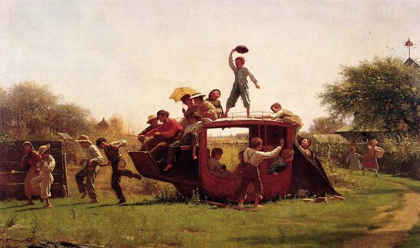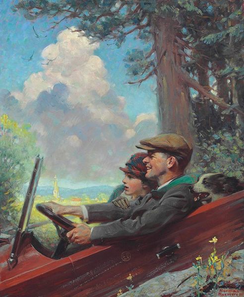 Arthur Sarnoff painted "Stroke," depicting a golfer in full swing, attended by his caddy and observed by companions in a golf cart. Sarnoff, an American artist, thrived in a time when commercial art and illustration were at their peak, using his skills to capture scenes of everyday life, often imbued with humor and an aspirational quality. In mid-20th century America, golf was a leisure activity largely associated with wealth and white, male privilege. Sarnoff’s painting gently nods to this social reality. It's worth reflecting on how the composition reinforces societal norms, where certain spaces and activities were predominantly enjoyed by a specific demographic. The caddy, often a figure of color in this era, is literally and figuratively positioned to assist. Consider how Sarnoff’s piece both reflects and perhaps subtly reinforces the social architecture of his time. It invites us to consider the narratives we tell ourselves about leisure, access, and who gets to play.