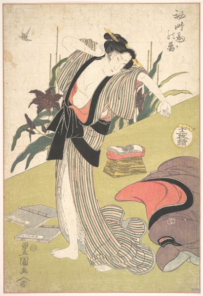 Helen Hyde made "A Mexican Coquette" as a woodblock print, and it's fascinating how she captured a moment with such delicate lines. Look at how the ink gently settles on the paper, creating soft, almost dreamy textures. The colors are muted but full of life; that dusky pink and faded green create such an intimate atmosphere. Notice the way the line of the branch almost reaches out, it creates this sense of reaching, connecting to the hand of the coquette. The cat, the children, and the woman, all seem to share a secret, connected by curiosity. It reminds me a bit of Mary Cassatt's gentle domestic scenes, where everything feels so personal. Ultimately, it’s about these fleeting moments, captured in ink and wood, inviting us to reflect on connection and intimacy.