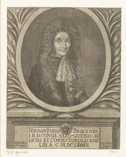 Curator: Looking at this engraving, made by Matthias van Sommer in 1666, the first thing I notice is how severely stylized it is. It’s starkly monochrome and rigorously linear. Editor: I see a man embedded within networks of power, literally framed by sharp geometries and textual pronouncements. The portrait of Johann Joachim Persius von Lonsdorf feels very much a declaration of status and authority. Curator: Absolutely. Observe how the cross-hatching creates subtle gradations, yet emphasizes structure rather than modeling. Notice too, the calculated arrangement of lines in the face to mimic his curly wig, creating an undulating visual echo, with his stare unwavering, as if to solidify a very precise aesthetic agenda. Editor: The overt declaration present in the inscription identifies Persius von Lonsdorf by title rather than intrinsic merit, solidifying the hierarchies of the Baroque period where status and legacy overshadowed individual identity, something that resonates in various other portrayals of aristocracy in that time. Curator: Precisely! Sommer employs techniques of repetition—notice the shape of the outer frame repeating inwards—establishing compositional harmony that speaks to the inherent order sought during this period of intense cultural and intellectual flourishing in Europe. The details work in harmony to speak of grandeur. Editor: It’s difficult not to view such portraiture through the lens of social theory. The rigid presentation and the weight of codified information speak of structures built around patriarchy and entrenched power structures. Persius von Lonsdorf’s pose conveys a specific assertion tied deeply within societal stratifications. Curator: And the material—engraving—mirrors this, creating reproducibility that could circulate the subject's image, fixing his identity in a wider societal consciousness through very exacting formal choices, with minute lines contributing to grandiloquence. Editor: Understanding the power dynamics inherent in art making helps us understand the artwork, and the way societal pressures affect the work and our interpretation. Thank you for your perspective. Curator: Thank you. Looking closely at its structure deepens appreciation for how artistic choices articulate period ethos.