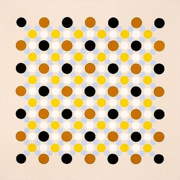 Curator: Gosh, at first glance, it’s kinda hypnotic, isn't it? Like staring into one of those old magic eye posters, waiting for the hidden sailboat to pop out. Editor: Indeed. What we have here is "Carre bleu et noir," an acrylic painting created in 1980 by Antonio Asis. Immediately apparent is the highly structured geometric composition of squares containing contrasting circles. Curator: Squares within squares, circles dancing inside... It’s making my head spin! All I can think of is a checkerboard gone abstract-chic. Almost like if Piet Mondrian had a sense of humor and really liked polka dots. Editor: Beyond the playfulness, though, there's a fascinating exploration of pattern, rhythm, and spatial relationships. The alternation of the black and blue creates visual tension that draws the eye across the surface. The rigid hard edges contain perfectly drawn shapes, with their color contrasting one another; there's also a sort of softness created through color theory at play here, as if one needs to decode this optical effect. Curator: Exactly! There's a subtle vibrancy... a visual buzz that keeps you locked in. Even the slightly uneven application of the paint seems intentional, as though Asis wanted us to question our perception and engage with a subtle shift, revealing all sides through what can be considered perfection and a touch of the raw. And what's this got to do with movement anyway? It does create this vibrating aura through contrasting color choices and how one looks at the artwork. Is this "Hard-Edge painting" meant to trigger some senses or to challenge them? Editor: The beauty lies, in part, in its embrace of optical illusion, the very way the composition forces your mind to interact with pattern as an interpretive language or some philosophical question regarding structure, color theory, or simply about visual information; yet on the other hand, the colors provide a relaxing sensation when one is looking at the piece long enough to stop seeking logical perfection. Curator: Well, my brain officially feels patternized, but I think I love it. What starts as a basic geometrical layout morphs into an experience of shapes, space, and motion. So unexpected and deeply mesmerizing! Editor: Absolutely. It really demonstrates how structure, color, and spatial arrangement interact, challenging our sense of vision and logic while providing visual stimuli that is anything but neutral. A simple piece with rich complexity to experience!