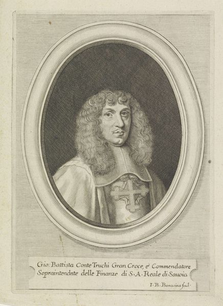 Curator: This engraving, created in 1661 by Pieter van Schuppen, depicts the Portrait of Pierre Ignace de Braux. It's currently held at the Rijksmuseum. Editor: It's so precise, almost photographic in its detail, particularly the subject's elaborate hair. But there's a coolness to it. It feels more like documentation than an attempt to capture a personality. Curator: The line work certainly emphasizes a clinical realism, wouldn't you agree? The engraving technique lends itself to the almost scientific detail apparent here. Notice how van Schuppen meticulously renders textures from the ornate wreath surrounding the portrait to the velvet and lace. Editor: The abundance of embellishment, from the laurel wreath to the inscription and heraldic crest beneath, screams of the Baroque period’s embrace of opulence as an indication of social status and authority. We have this very controlled image, set against symbols declaring his pedigree. It presents an ideal rather than an individual. Curator: The framing composition guides the viewer's eye. From the symmetrical placement of the wreath to the centered crest, everything enhances a sense of equilibrium and order. The choice of the octagonal frame is also compelling – less common than a circle or rectangle, yet perfectly suited here. Editor: It’s fascinating how portraiture functioned during this era. Here, the display of nobility seems to overshadow the person. How much of what we’re seeing is about historical accuracy and how much about upholding societal hierarchies? And where does the museum, as an institution, factor into preserving and even reinforcing these notions? Curator: Precisely! Looking closer, it reveals that this engraving isn't merely an artwork. Instead, it’s a careful performance designed to situate de Braux within a very particular historical narrative. Editor: Thinking about that carefully constructed persona you mentioned makes me reconsider my initial feeling of coolness. There's something intriguing, and intentionally distant, about this figure positioned so deliberately within his world.