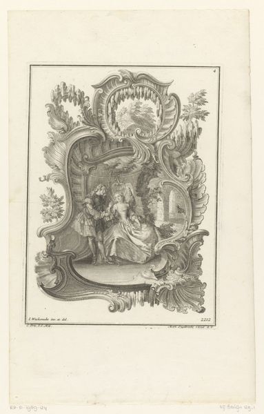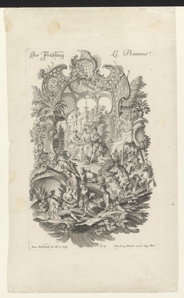 Curator: Oh, isn't that something? This is a Baroque engraving entitled "Hercules," created sometime between 1721 and 1756. Look at that incredible detail rendered simply with ink and paper! Editor: It feels theatrical, almost dizzying, with its swirling ornamentation. The figures are so idealized; there's a sense of constructed grandeur rather than genuine emotion. I'm also curious, what exactly is happening here? Curator: We're seeing Hercules in his iconic role – the epitome of strength, perhaps holding up, not exactly the sky, but something symbolic, with, seemingly, the entire world represented by a large orb at the center. The artist seems preoccupied with visually representing complex allegories, likely political statements, given the era and context. Editor: Yes, Hercules here isn't just muscle; he represents virtue, and that ornate cartouche frames him like he’s a stage hero. And I read a continuity of the image into cultural memory: the baroque splendor meant to impress is now almost kitsch, power aging into camp. It makes you question the messages that remain once their contexts fade. Curator: That's a clever take, about "power aging into camp"! I see this overwhelming ornamental aspect too, that maybe once spoke of the ruler’s sophistication, today it can feel overdone. In its own way, it's just as informative. I suppose it all goes to prove just how potent visuals become across time! Editor: Absolutely! I initially felt overwhelmed by the complexity, now it almost makes me sentimental in the face of such artistic intent and symbolic thought. We should admire more works such as these, allowing a fuller conversation and investigation of our histories!