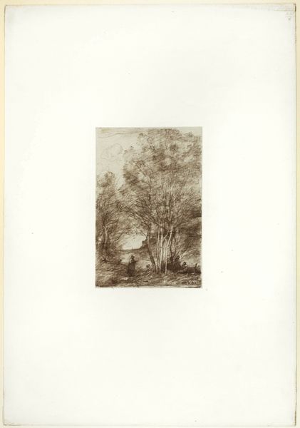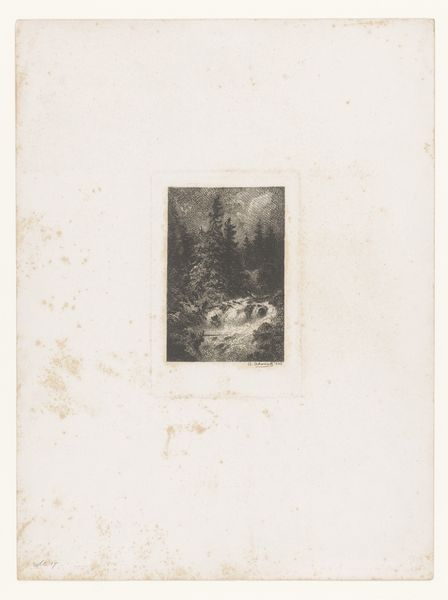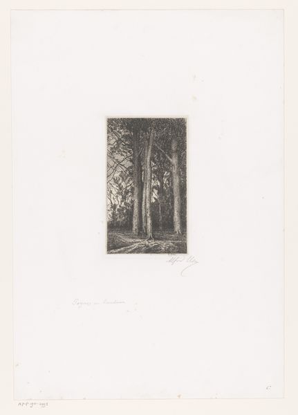 Editor: Here we have "Bosgezicht bij maneschijn," a print, more precisely an etching, dating from between 1860 and 1910, currently at the Rijksmuseum. I am immediately struck by the quiet mood; it is intimate but also seems somewhat secretive. How do you interpret this work? Curator: I see this piece as more than just a landscape; it’s a socio-political statement. The lone figure seemingly observing or working implies the complex relationship between labor and environment in 19th-century Netherlands. The forest, illuminated by the moon, isn't just scenery; it symbolizes both refuge and potential resource for a society undergoing rapid industrialization. Consider who had access to such spaces, and who was excluded. Editor: So, are you suggesting that the artist consciously chose this subject matter to represent certain power dynamics? Curator: Precisely. The very act of depicting this scene can be read as a commentary on land ownership and usage during a time of stark social inequalities. Was this land public or private? Who benefited from the forest's resources, and who faced exploitation? How do we see the representation of nature, not simply as beautiful, but deeply connected to social issues and class? Editor: It's interesting that you mention this, because at first glance, I didn't consider how wealth and societal structures impacted the art or the very act of seeing that art in the first place. I appreciate that perspective, because art provides a great framework for current-day discussions about similar societal patterns that still take place. Curator: Exactly! This print invites us to consider whose stories are told, and whose are often left untold, through art, echoing complex political narratives from past to present.