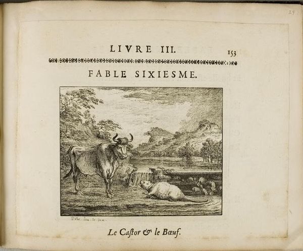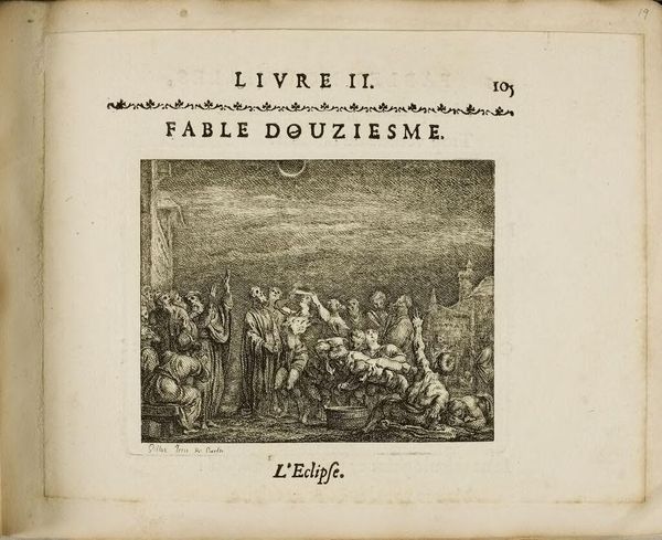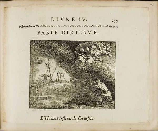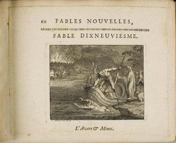 Curator: This is "Love and Death" by Bernard Picart, an etching dating back to the early 18th century. It resides here at the Harvard Art Museums. Editor: It's striking how Picart juxtaposes the youthful figure of Love with the skeletal representation of Death. The overall mood is quite somber. Curator: Indeed. Picart, active during the Enlightenment, often used his art to explore complex moral and philosophical themes. This piece reflects the period’s fascination with mortality. Editor: The imagery feels incredibly loaded. Love's arrows lie broken while Death carries what looks like a shattered staff. The socio-political interpretation of power seems clear. Curator: This image was originally made as an illustration for a fable. The dynamic composition and allegorical elements were intended to convey broader ideas about the human condition. Editor: And, ultimately, the ever-present tension between life-affirming forces and the inevitability of death. It is thought-provoking, even centuries later. Curator: Absolutely. It offers a snapshot into the intellectual climate of Picart's time. Editor: A poignant reminder of the transient nature of existence.