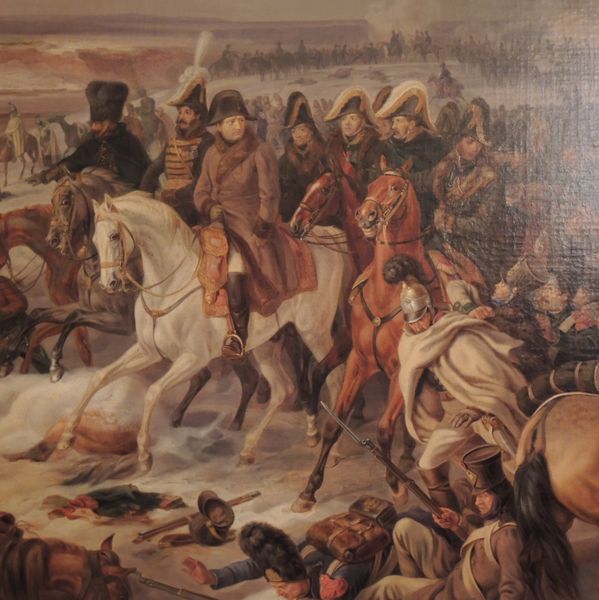 Curator: Albrecht Adam's "Retreat of French Troops from Russia," painted in 1830, presents a grim episode of military history. What stands out to you most upon seeing it? Editor: It’s overwhelmingly bleak. The palette is subdued, dominated by cold browns and grays. You can almost feel the biting wind and the weight of defeat settling in your bones. The textures look heavy, even sluggish, mirroring the arduous journey the figures are making. Curator: Precisely. Adam captured not just a historical moment, but the very sensation of collapse. Note the body language of the figures—slumped shoulders, weary gaits. The painting serves as a symbol of the catastrophic hubris of Napoleon’s ambition, which brought immense suffering. The retreat itself, in a symbolic manner, denotes the folly of expansionism and a certain fragility to empire. Editor: I’m curious about Adam’s choice of oil paint for this subject. The thickness and layering, which creates a tangible, almost sculptural quality, speak volumes. I mean, imagine the logistics of depicting this scene—the scarcity of supplies for the troops and likely for the artist too. It highlights the resourcefulness and sheer effort involved. What sort of patronage did Adam have to execute something on this scale? Curator: Adam worked extensively for royal patrons. However, there's something in the downcast eyes, as well as postures and faces, that feels profoundly human. He avoids idealization of any of the actors within this drama, offering a study in shared anguish. Editor: A poignant study in failure on all sides. I’m struck by how Adam transforms a political and military event into a broader reflection on endurance, loss, and the cost of conflict. The materiality of paint almost makes it a memorial or a record. Curator: Agreed. "Retreat of French Troops from Russia" acts as a meditation on how visual imagery encodes enduring historical memory. Editor: I am particularly affected by how the piece connects historical events and intimate human experience through artistic method.